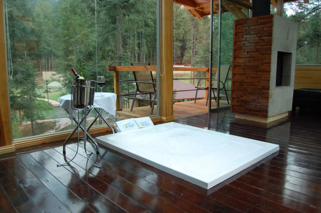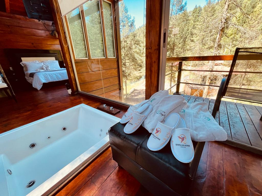 Quinta los Azufres tiene cabañas con grandes ventanales que te permiten estar en armonía con la naturaleza mientras disfrutas los espacios de tu habitación, la bañera tiene vista al lago de la propiedad. Cada una de estas cabañas de lujo tienen terraza, chimenea, jacuzzi, sala y cocina, cafetera, amenidades de lujo, áreas comunes y una alberca techada climatizada.