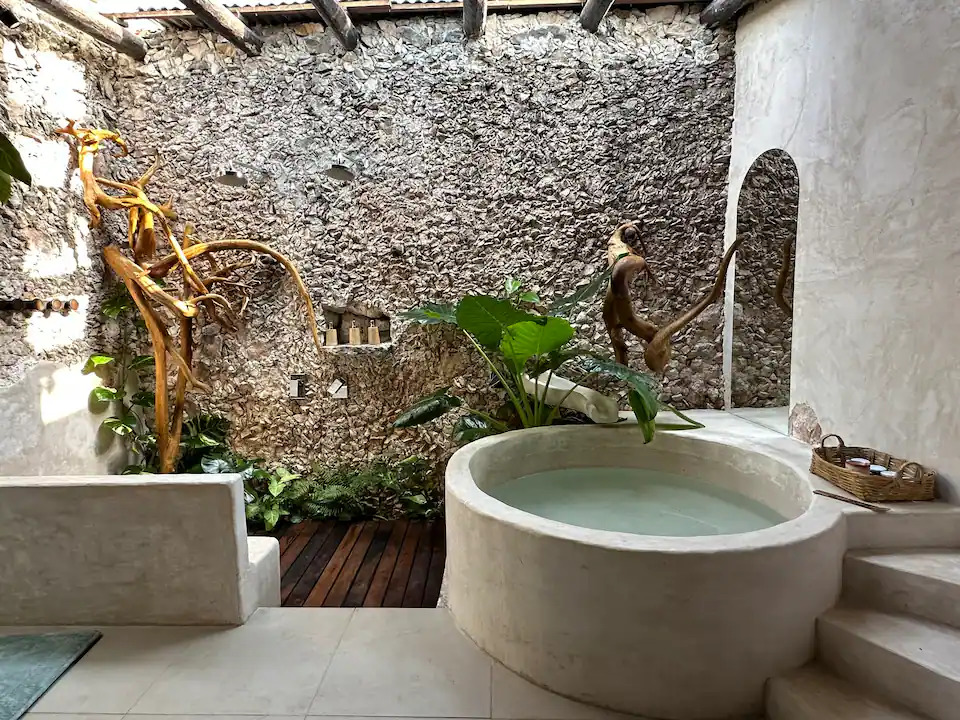 Este airbnb en Yucatán cuenta con una cama king size, un sofá cama matrimonial, una cocina, área de estar y comedor, así como un baño con tina de cemento, una terraza privada, área de fogata, hamacas, entre otras amenidades que conservan su construcción rústica. Aunque Casa Yaxunah es un alojamiento pensado únicamente para parejas, en ocasiones, es posible alojar a grupos o familias de hasta 5 personas, pero no más, debido a que no hay suficientes habitaciones y camas.