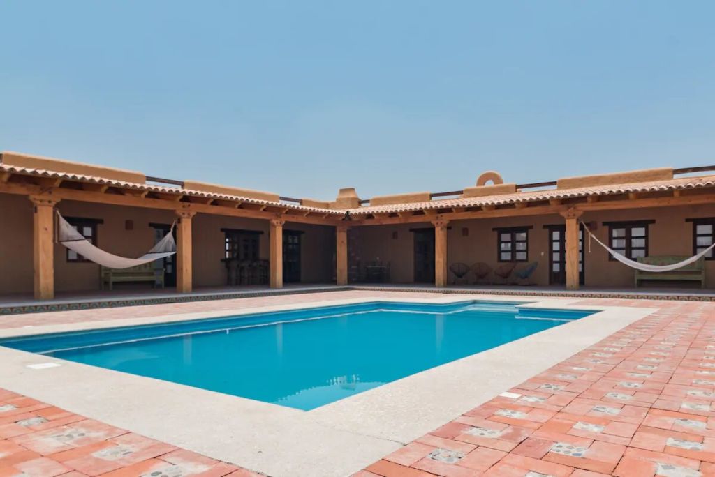 Hospedarse en Villa Rey es como habitar una auténtica y tradicional hacienda. Ubicada a las afueras de Oaxaca, es una amplia y espaciosa villa que puede acomodar hasta más de seis personas. Su decoración es bastante mexicana y hospitalaria, con azulejos de talavera, muebles coloridos tallados en madera, espejos artesanales y obras de arte nacional. Además, cuenta con una gran alberca privada rodeada de cactus y hamacas, así como una terraza con una pequeña fogata y tumbonas.