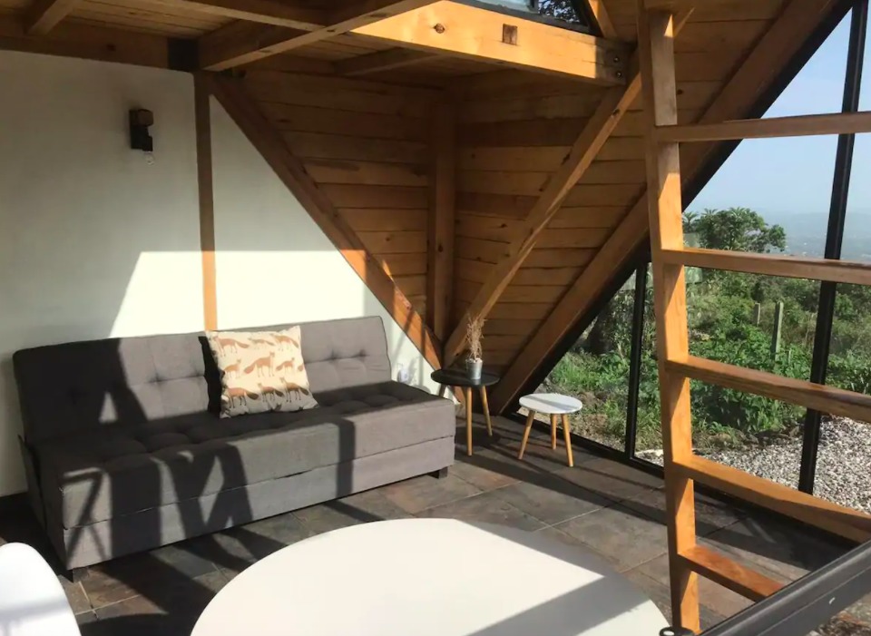Este precioso y moderno Airbnb cerca de la CDMX es ideal para parejas que buscan escapar un rato del caos de la ciudad y convivir en un espacio natural y tranquilo. La cabaña cuenta con una cama matrimonial en la parte alta y un sofacama frente a una televisión con sistema de cable y chimenea, comedor y baño completo. Lo mejor de este alojamiento son los ventanales de piso a techo que te hacen disfrutar de la naturaleza mientras te relajas.