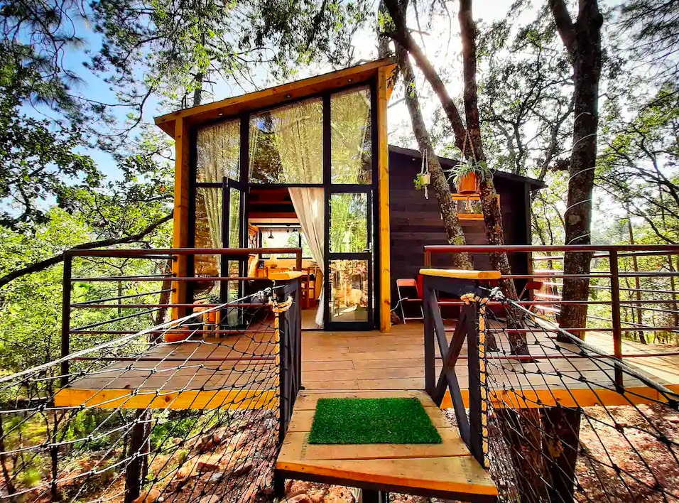 Ubicado a aproximadamente dos horas y media de la CDMX, se encuentra este precioso y único alojamiento, un lugar distinto en el que podrás disfrutar de un descanso entre los árboles. El Airbnb consiste en una cabaña suspendida en el bosque, equipada con todo lo necesario para garantizarte la máxima comodidad y seguridad. Con dos recámaras, una con cama matrimonial y una con queen size, Wifi y una cocina equipada, esta casa del árbol te conquistará desde tu llegada.