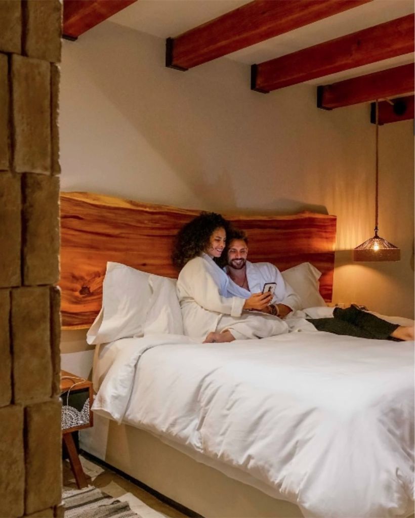 En cuanto a las habitaciones, cuenta con un total de 37 divididas en diferentes categorías y de las cuales solo 6 tienen camas dobles –el hotel está pensado idealmente para parejas–. Las más nuevas son las Suites Premium, en las que podrás disfrutar de un hermoso patio privado lleno de vegetación y una fogata, amplios espacios y una sutil decoración contemporánea de inspiración Tepozteca con detalles artesanales. Además, están equipadas con una deliciosa cama King Size, regaderas de lluvia y amenidades de baño orgánicas.