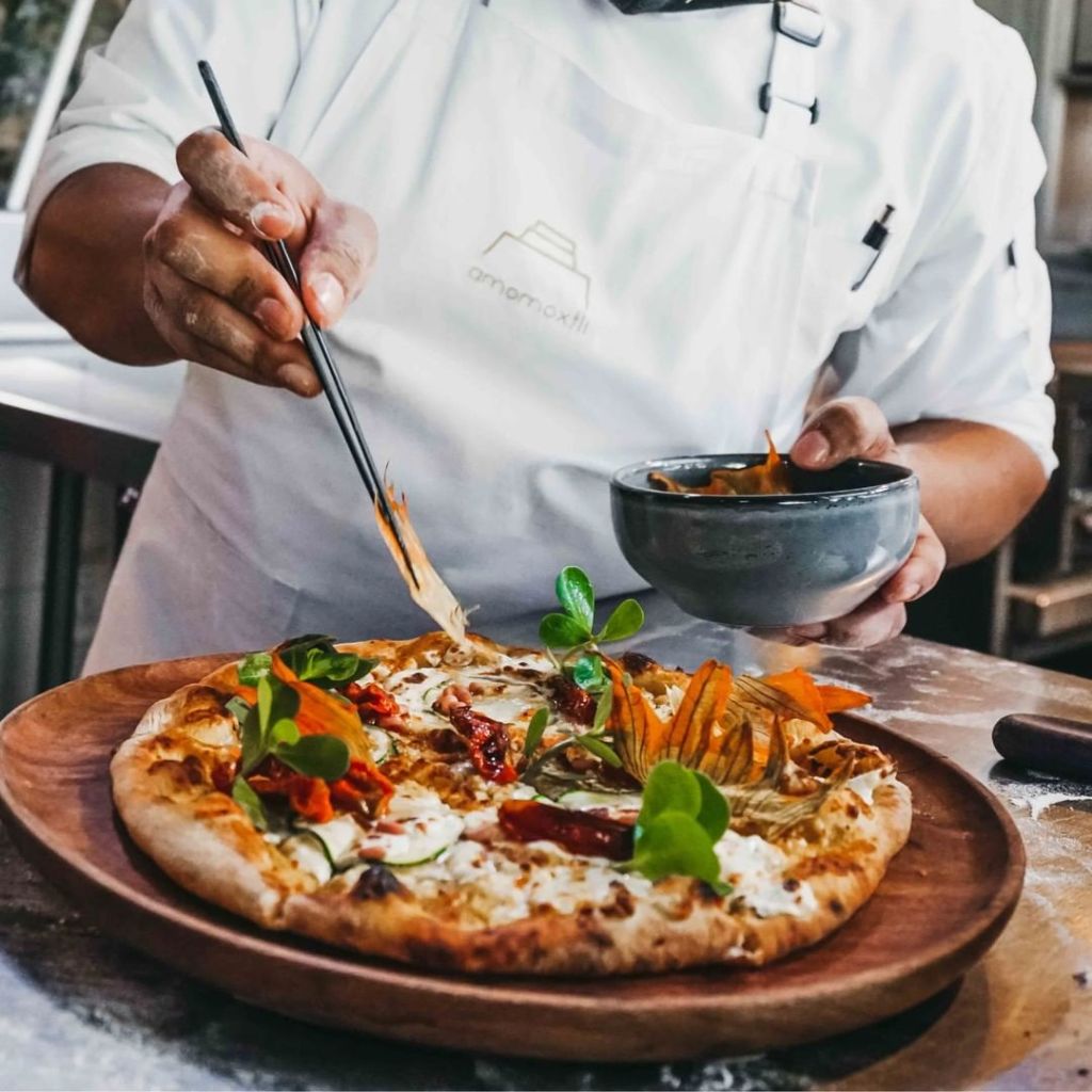 Algunas de nuestras recomendaciones son la pizza de pesto de flor de calabaza con calabacita criolla, queso de cabra y tomate deshidratado y el arroz meloso del estado de Morelos DO, con hongos silvestres, queso de cabra de Huitzilac y jamón curado de 3 Marías.