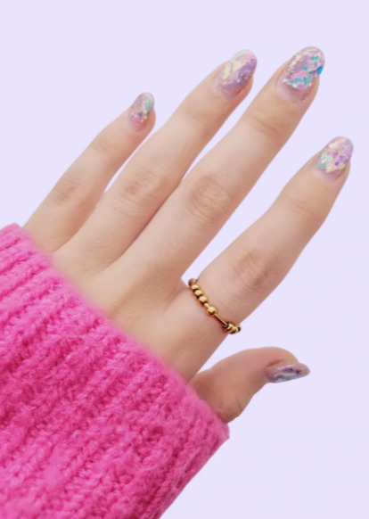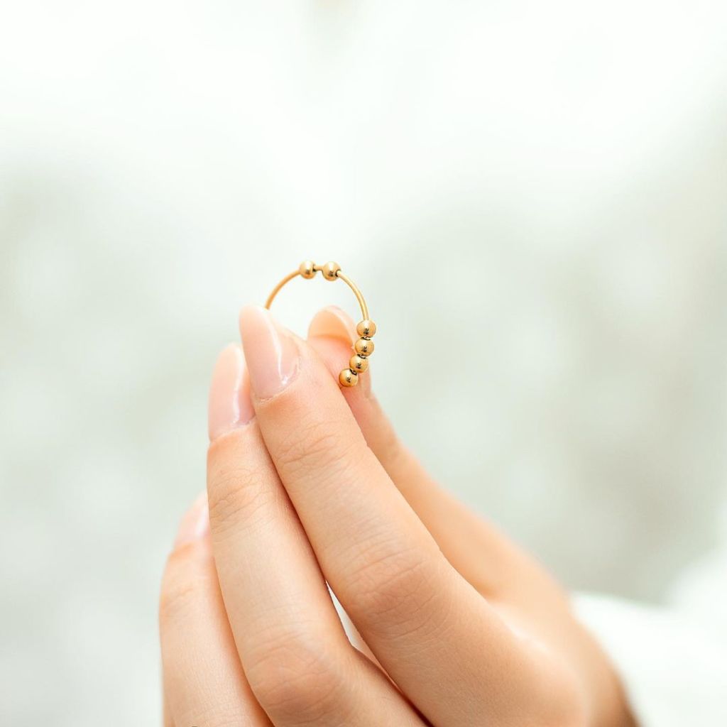 Otro anillo de bolitas hecho con acero inoxidable y chapa de oro de 18K, perfecto para dejar de morderte las uñas y lastimarte los dedos. Mueve suavemente cada una de las bolitas y relájate, todo mientras adornas tus manos espectacularmente.