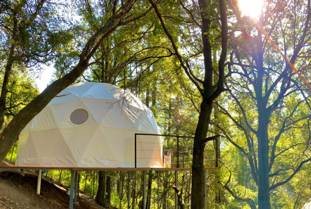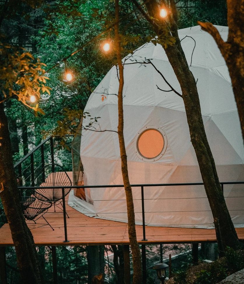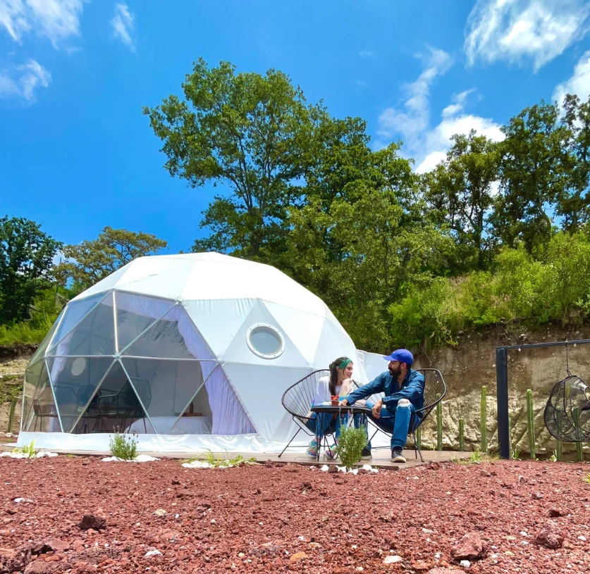 Este glamping destaca por sus maravillosos domos de lujo, perfectos para vivir la experiencia de acampar al aire libre dentro de un alojamiento bastante cómodo y privado. Su domo para parejas asegurará una estancia bastante romántica, y en múltiples ocasiones incluso se ha empelado para pedidas de mano por lo increíble de su espacio, que incluye chimenea vintage, fogatón independiente, terraza con columpio de capullo y cama de red.