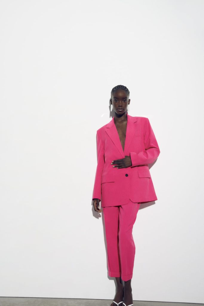 Aunque el barbiecore se basa fundamentalmente en el rosa, no es el único color en la paleta. El color blocking se basa en la variedad de colores, pero pensándola como bloques y evitando patrones que rompan con la unidad cromática. Elige una (o más) prenda totalmente rosa, y combínala con otra de otro color. Puedes elegir mezclarlo con otros colores brillantes que lo complementen—como verdes, naranjas, azules y morados en diferentes tonos— o bien decantarte por un poco más sobrio contrastando el rosa con prendas en blanco y negro (aunque en realidad ‘sobrio’ y ‘barbiecore’ son prácticamente opuestos).