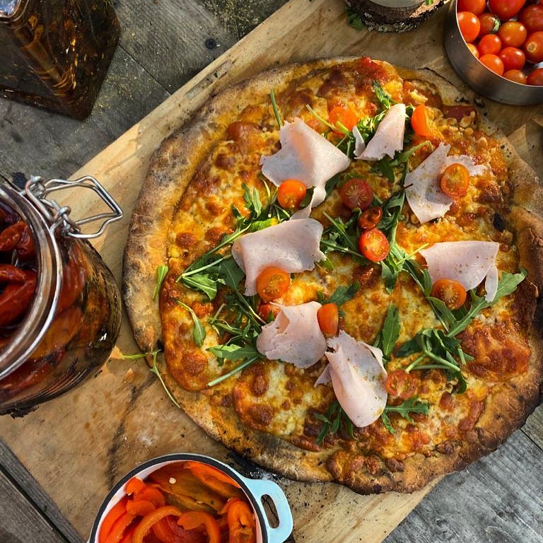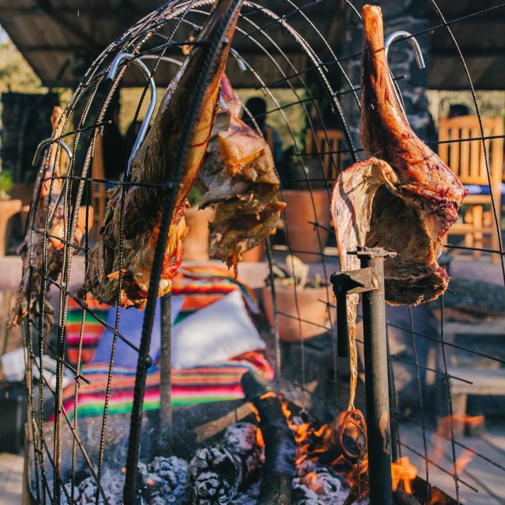 En el menú las pizzas a la leña, los asados de tira, las verduras con aceite de ajo y el cordero a la jaula son algunos de los platillos que puedes compartir en la mesa comunitaria o simplemente quedarte en el quincho con tu pareja y disfrutar una tarde de asado con un buen corte como: el pampiano a la mantequilla con romero, tomillo, ajo y cebollitas cambray, acompañado de un vino tinto del Rancho Mogorcito de Valle de Guadalupe.