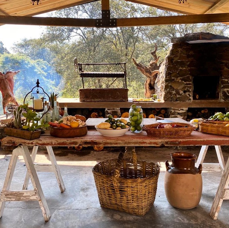 Desde el momento que llegas a este lugar se siente el aroma de la leña y la tranquilidad del campo, sus espacios abiertos y su quincho de madera que te deja ver la cocina de leña al fondo te harán sentir reconfortado. Una copa de vino méxicano acompaña el recorrido que comienza por el vergel y continua en la cocina en la cual te puedes acercar a platicar muy a gusto con el chef, quien se encarga de deleitar a los comensales con un asado completo.