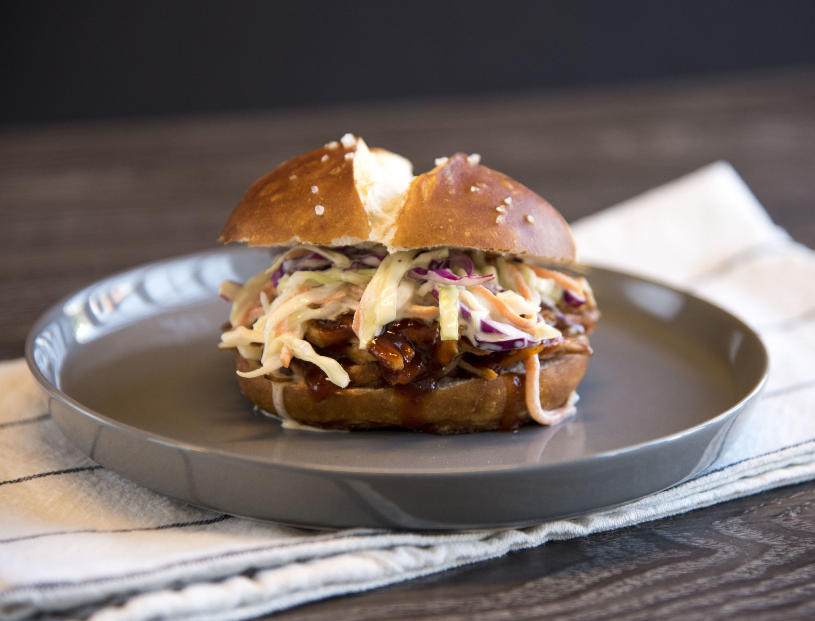 Relleno de puerco y horneado por varias horas, mezclado con salsa bbq de la casa y ensalada de col.