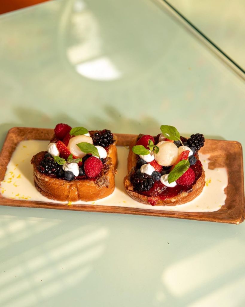 El brunch funciona pidiendo cada platillo de forma individual pero estos se sirven de forma abundante, así que nuestra recomendación es pedir varias cosas al centro para compartir y tener la oportunidad de probar más de uno. De los sándwiches nuestros favoritos son el French Toast – esponjosito pan brioche servido con una deliciosa crema inglesa de romero y naranja, mermelada de ponche, frutos rojos y lichi–, el Toast de aguacate – con pepinillos curados, queso feta asado y huevo pochado – y el Sándwich de tocino hecho en casa – con scrambled egg y alioli de la casa –, perfecto si te gustan los platillos más monchosos.