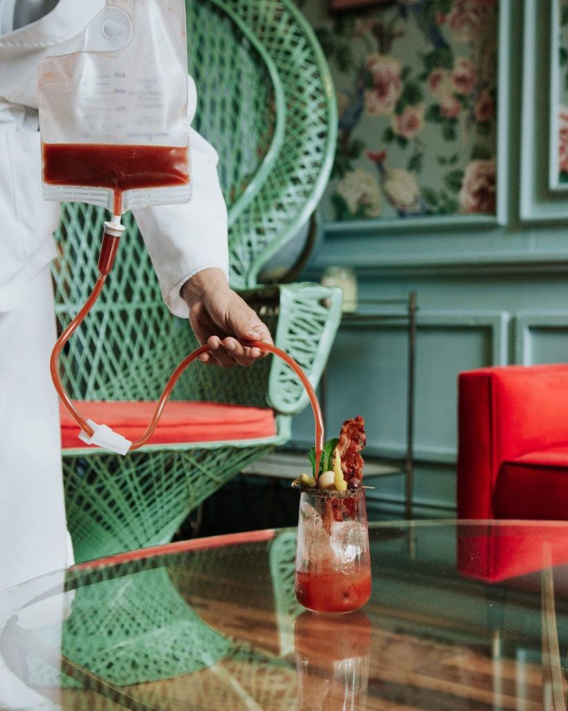 Si lo que te gusta es el show en la mesa, sirven el Bloody Mary, preparado con Vodka Ketel One, jugo de tomate de la casa y salsa bruja con brocheta de aceituna, chile güero, pepinillo, sal de chiles y bastón de apio. Éste llegará hasta tu lugar con un carrito como si se tratara de una transfusión, listo para reanimarte en caso de que hayas tenido una noche larga antes.