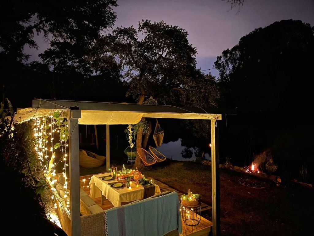 El espacio cuenta con dos camas matrimoniales, una terraza inferior y una superior (con comedor exterior perfecto para una cena romántica) y una estación cafetera. Es importante que consideres que, al ser una construcción flotante, los baños se encuentran dos niveles arriba, en el jardín. Cuentan con regadera con agua caliente y no se comparten con otras cabañas.