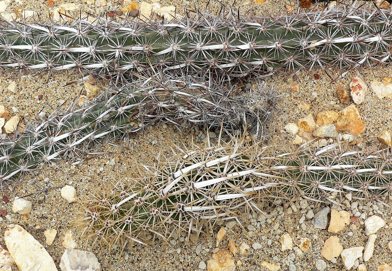 Esta especie endémica del estado de Baja California Sur, es el único cactus que no crece erecto. Por lo cual al crecer sobre el suelo, es capaz de desplazarse de lugar. Su forma alargada y grisácea se la debe a sus espinas, las cuales pueden llegar a causar mucho dolor si llegan a tener contacto con la piel. Además, al ser una especie en peligro de extinción está prohibido tocarlos.