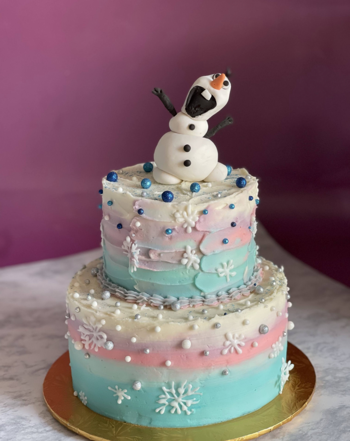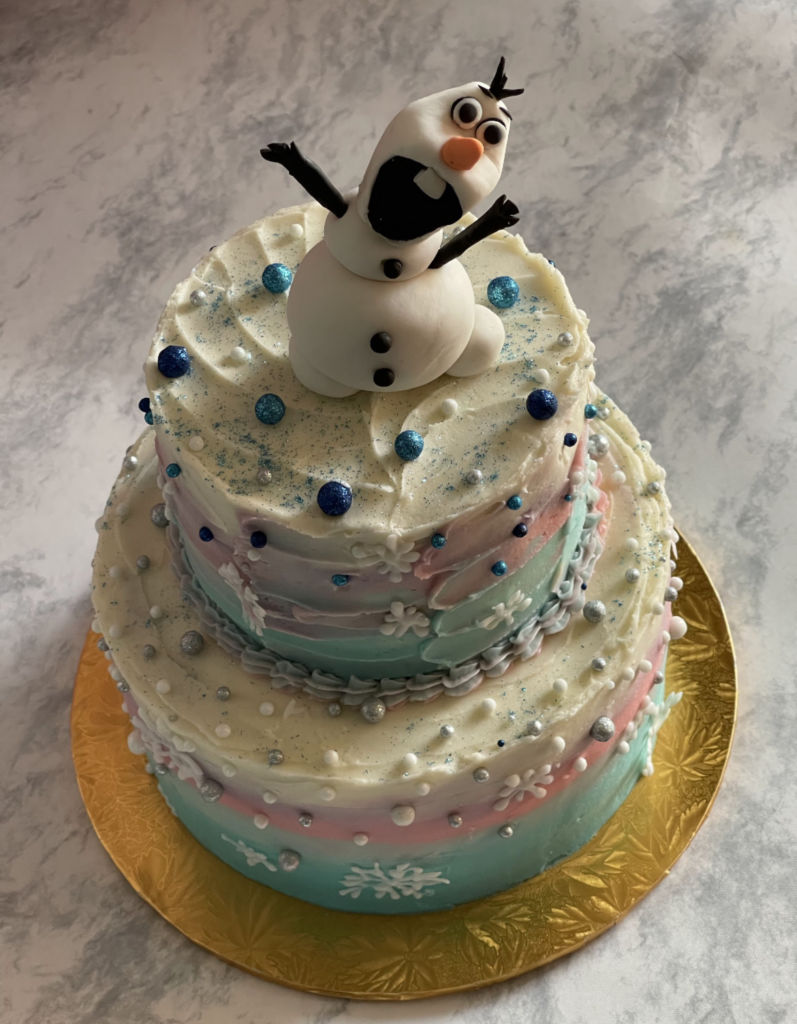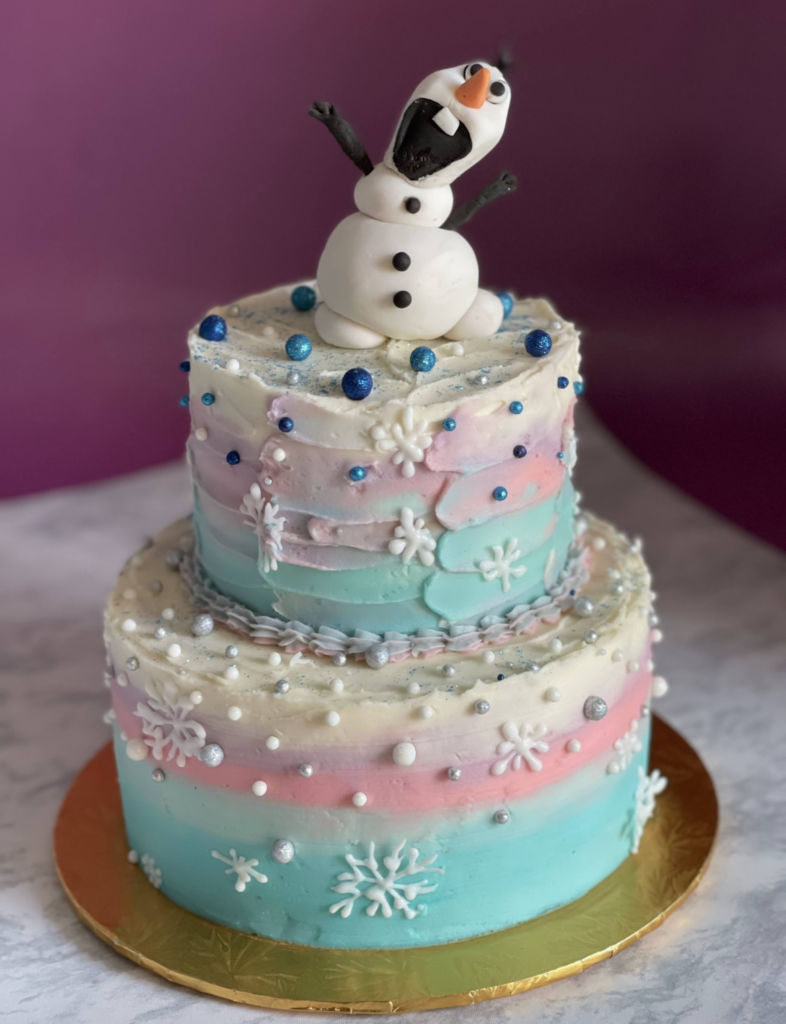 - La pieza de Olaf, se hace con fondant ya listo, este se puede pintar con tinta en gel. Al final se coloca encima del pastel de Frozen.
