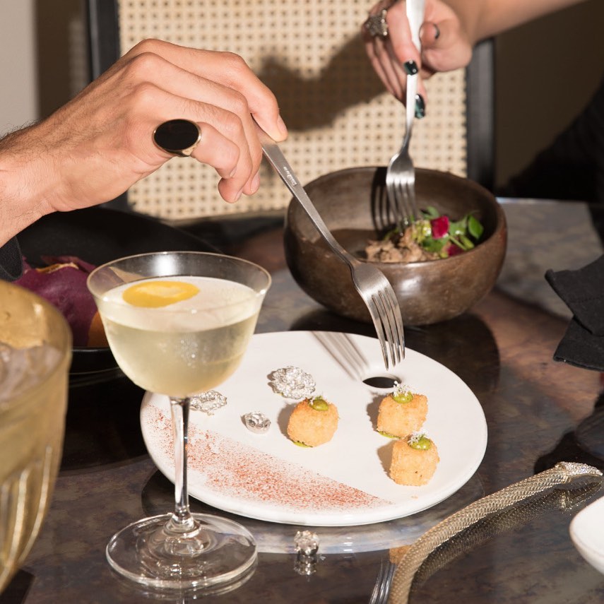 Otro de los grandes atinos de los espacios de Casa Prunes —además de un interiorismo moderno con guiños a las estéticas más retro— es su versatilidad. Para empezar, puedes elegir sentarte en alguno de los salones interiores, o bien decantarte por el patio central, con un techo retráctil ideal para una noche romántica sea cual sea el clima. Si prefieres algo un poco más íntimo, puedes reservar el privado o descubrir el cigar lounge en el segundo piso. Incluso es posible agendar una experiencia personalizada en el speakeasy ‘Crank’ o en la Mesa del Chef —perfecta para clases de cocina, catas o simplemente cenas especiales con el chef cocinando directamente frente a ustedes—.