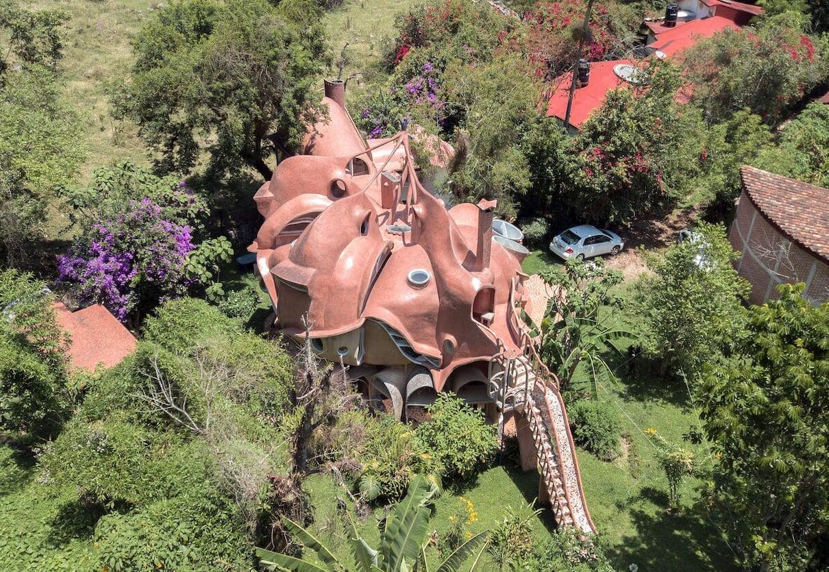 Para construir esta casa, el arquitecto les preguntó a sus primeros habitantes: ¿cuáles son tus sueños más salvajes? De esas conversaciones e ideas surgió la Casa de los Milagros, aunque hoy es más conocida como la Casa Pulpo porque, vista desde arriba, parece un animal marino en movimiento. Aunque su forma también puede recordar a un hongo, a una flor o hasta a un merengue; al final, puede ser el milagro que cada quien imagine. Este delirante refugio surrealista se encuentra en la localidad de La Pitaya, en medio de un bosque de niebla a unos pasos del río Pixquiac, a solo 10 minutos del centro de Xalapa y a 15 de Coatepec. A su peculiar arquitectura se suma el entorno: rodeada de densa vegetación, clima húmedo y paisajes boscosos, es el tipo de lugar que parece salido de un cuento de fantasía, y lo mejor es que puedes vivir en ella por unos días, perfecto para desconectar, escaparte a crear o simplemente contemplar y descansar.