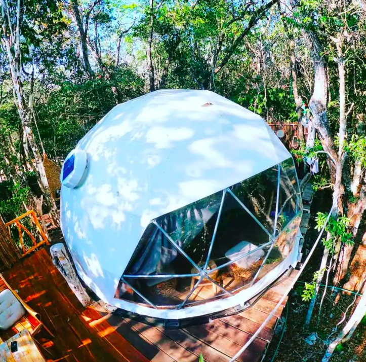 A tan solo 15 minutos de Tulum, en medio de la selva maya, se encuentra esta innovadora y ecológica casa del árbol en forma de burbuja, desde la cual podrás ver la bahía. Este alojamiento completamente privado está elevado a 30 metros de altura, entre los árboles, y para llegar a él solo necesitas utilizar las escaleras que te llevan a la cubierta. En el exterior, podrás disfrutar de una amplia terraza construida con materiales naturales, ideal para contemplar el entorno. Además, para los amantes de las experiencias acuáticas, a unos cuantos metros hay preciosos cenotes.