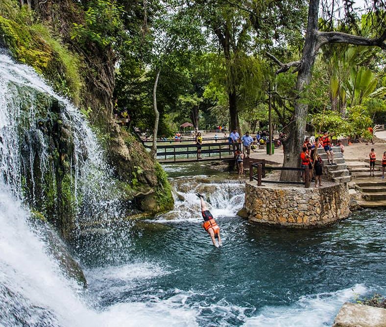 El secreto mejor guardado de la Huasteca Potosina son sus cascadas, esta zona conformada por 20 municipios tienen los cruces de ríos y cascadas más importantes del estado como la ‘Cascada Tamul’, una de las más populares. Sin embargo, este paraíso escondido en medio de la basta vegetación es uno de los balnearios más secretos del estado. Sus cristalinas aguas, la unión de sus cascadas y la biodiversidad de la zona, hacen de este paraíso un destino ideal para descubrir en tus próximas vacaciones. Acompáñanos a conocer las Cascadas de Tamasopo en San Luis Potosí.