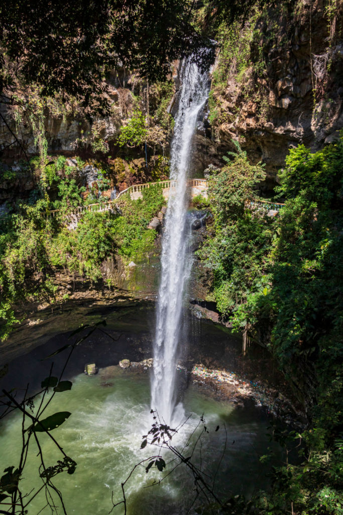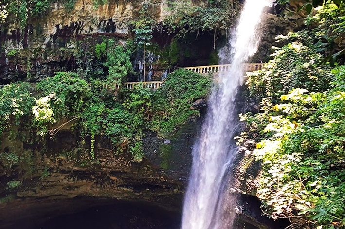 Su caída cuenta con más de 40 metros de altura, con preciosas formaciones prismáticas de basalto cristalizado que convierten el sitio en un verdadero panorama mágico. Se recomienda apreciarla desde el mirador localizado en su parte más baja, con un descenso de aproximadamente 100 metros que inclusive permite pasar por detrás de su salto de agua.