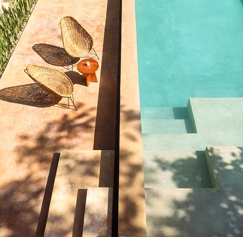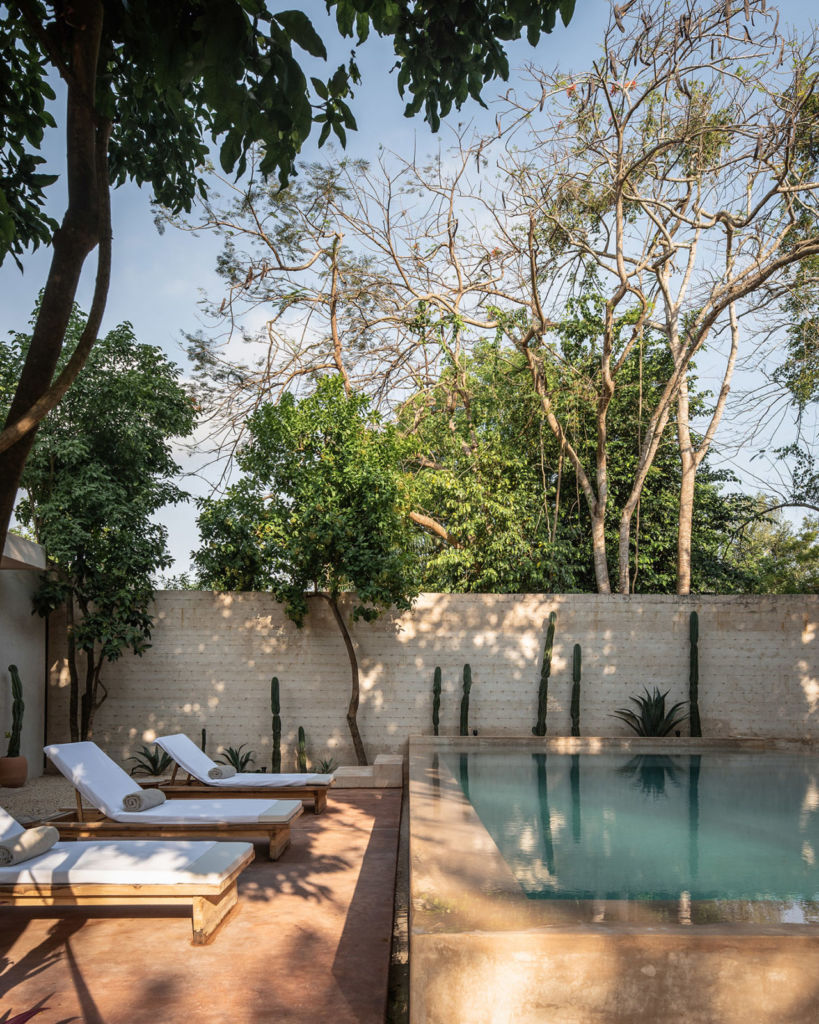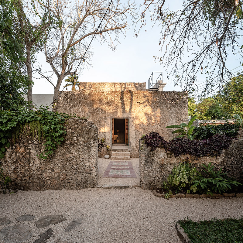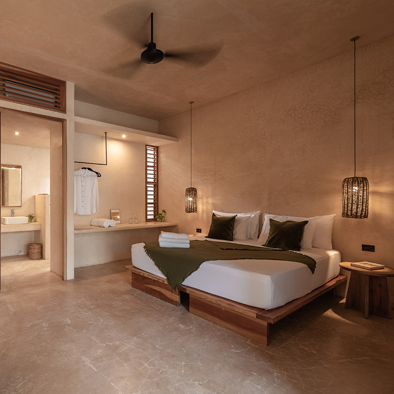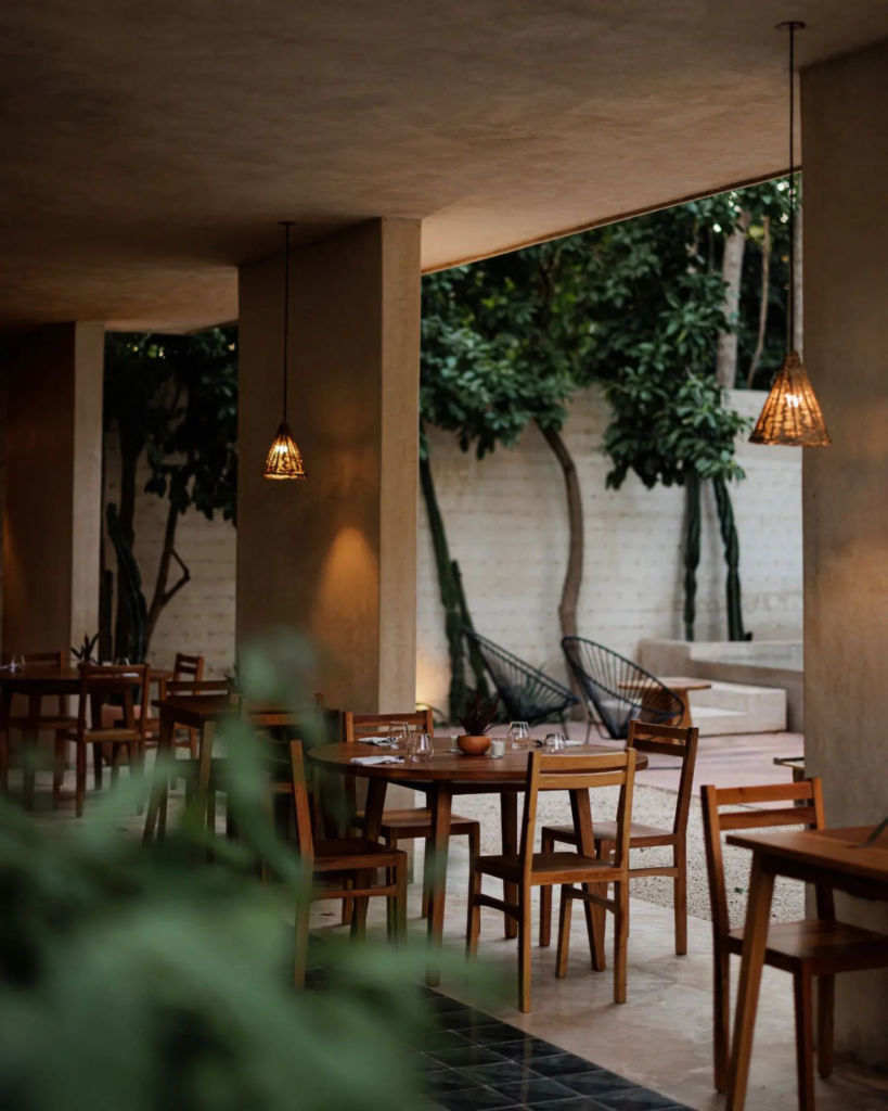 La arquitectura del lugar gira alrededor de los materiales locales —piedra, fibra natural, pixoy, chukum, madera y cal— y los principios de construcción tradicionales que preservan la frescura de los interiores, pero adaptados a un diseño contemporáneo que se fusiona además con un jardín tropical con plantas aromáticas. La suavidad, el refinamiento y la autenticidad son las palabras clave del proyecto, creando un diálogo estético entre el presente y el pasado.