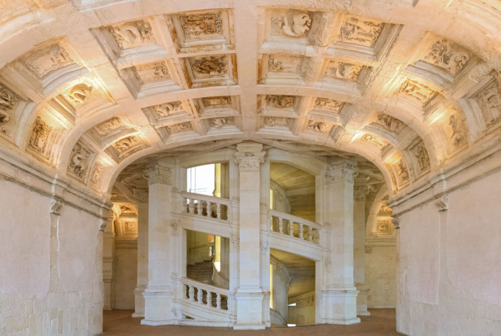 En 1519, el rey Francisco I ordenó la construcción del Castillo de Chambord sobre las tierras pantanosas a orillas del río Cosson para convertirlo en su residencia durante sus viajes de cacería. Además de la caza, el rey era un apasionado del arte y la literatura italianas, por lo que invitó a Leonardo da Vinci a permanecer en la corte de Francia como ‘primer pintor, arquitecto e ingeniero del rey’. Aunque el nombre del arquitecto oficial de semejante prodigio se borró con los años, existen razones para creer que da Vinci podría haber estado involucrado en el diseño del edificio, sobre todo por las influencias italianas y la espectacular escalera de doble hélice que caracteriza Chambord.
