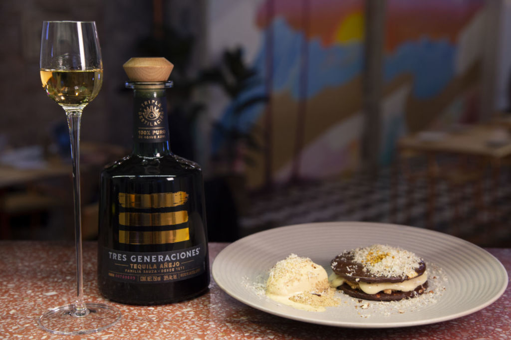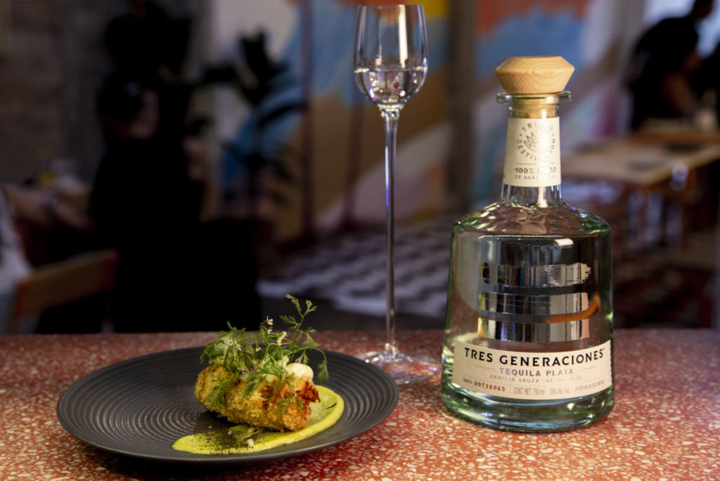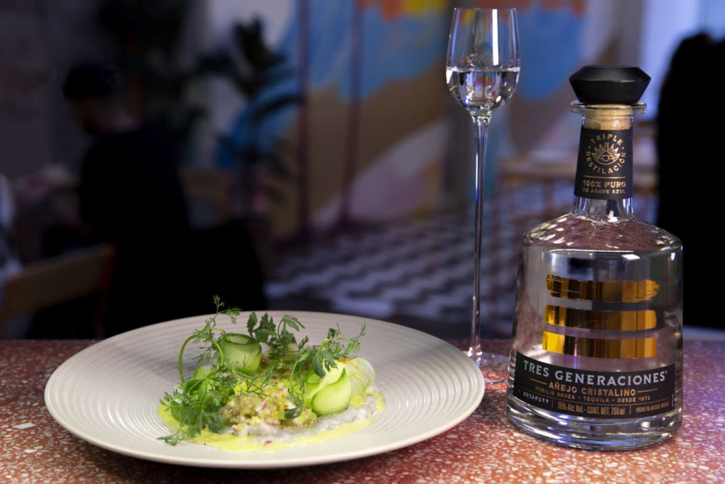 En el menú de la ‘cata de tequila’ encontrarás cuatro platos maridados con las cuatro etiquetas de Tequila Tres Generaciones. De entrada se sirve jaiba frita, con puré de aguacate y mayonesa cítrica maridado con Tres Generaciones Plata; de primer tiempo aguachile verde de camarón, con relish de nopal, apio y pepino persa acompañado de tequila Tres Generaciones Añejo Cristalino; como plato fuerte risotto de mariscos, maridado con un tequila Reposado y de postre un S’more blanco y obscuro con crumble de pinole y helado acompañado de su tequila Añejo.