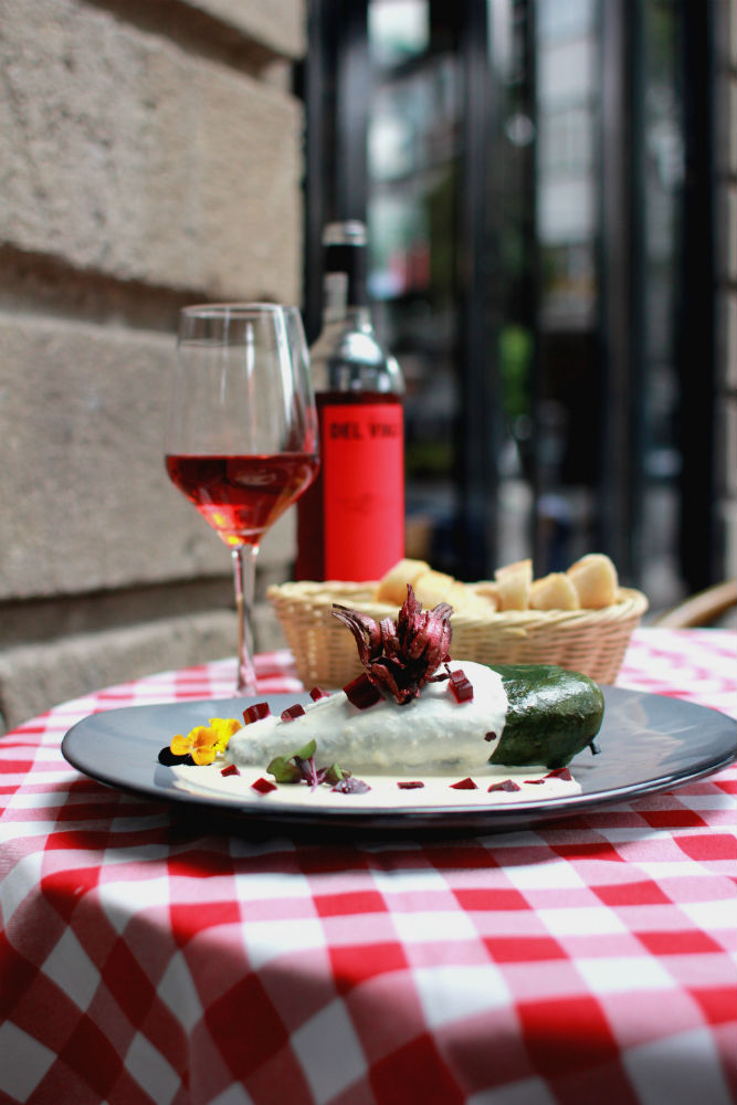 Desde el año pasado, introdujeron en su menú un increíble chile en nogada a la francesa. Preparado con un chile poblano relleno de pato a la naranja con dulce de membrillo y bañado en salsa de almendras y jengibre. Además, para sustituir la tradicional granada, el chef Emmanuel Chabre decidió utilizar cuadritos de jamaica que le dan a la preparación notas ácidas y, a la apariencia, los tonos rojos que, junto con el blanco de la salsa y el verde del chile, completan los colores de la bandera nacional. El platillo es una verdadera delicia que, a pesar de no ser estrictamente un chile en nogada por no tener, salvo el chile, ninguno de los ingredientes tradicionales, simula los sabores, texturas y la experiencia de degustar este maravilloso plato típico.
