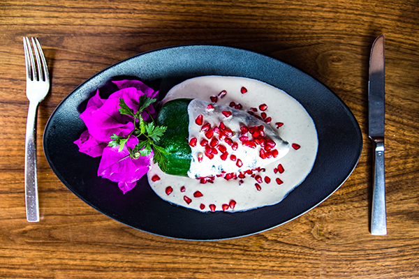 Al ser la primera temporada de fiestas patrias para Comal de Piedra, el chef Othón Gayosso quiso reinventar la tradicional receta de chile en nogada con algunos aspectos que resaltaran más los sabores clásicos de esta preparación, pero respetando, en gran medida, la esencia del platillo. El resultado es un exquisito chile poblano, que conserva un poco de su picante natural, relleno de carne molida con frutos secos, endulzada con xoconostle, en lugar de acitrón. La nogada la prepararon con requesón, en lugar de queso de cabra, lo que le da más acidez a la salsa y realza el sabor de la nuez de castilla.