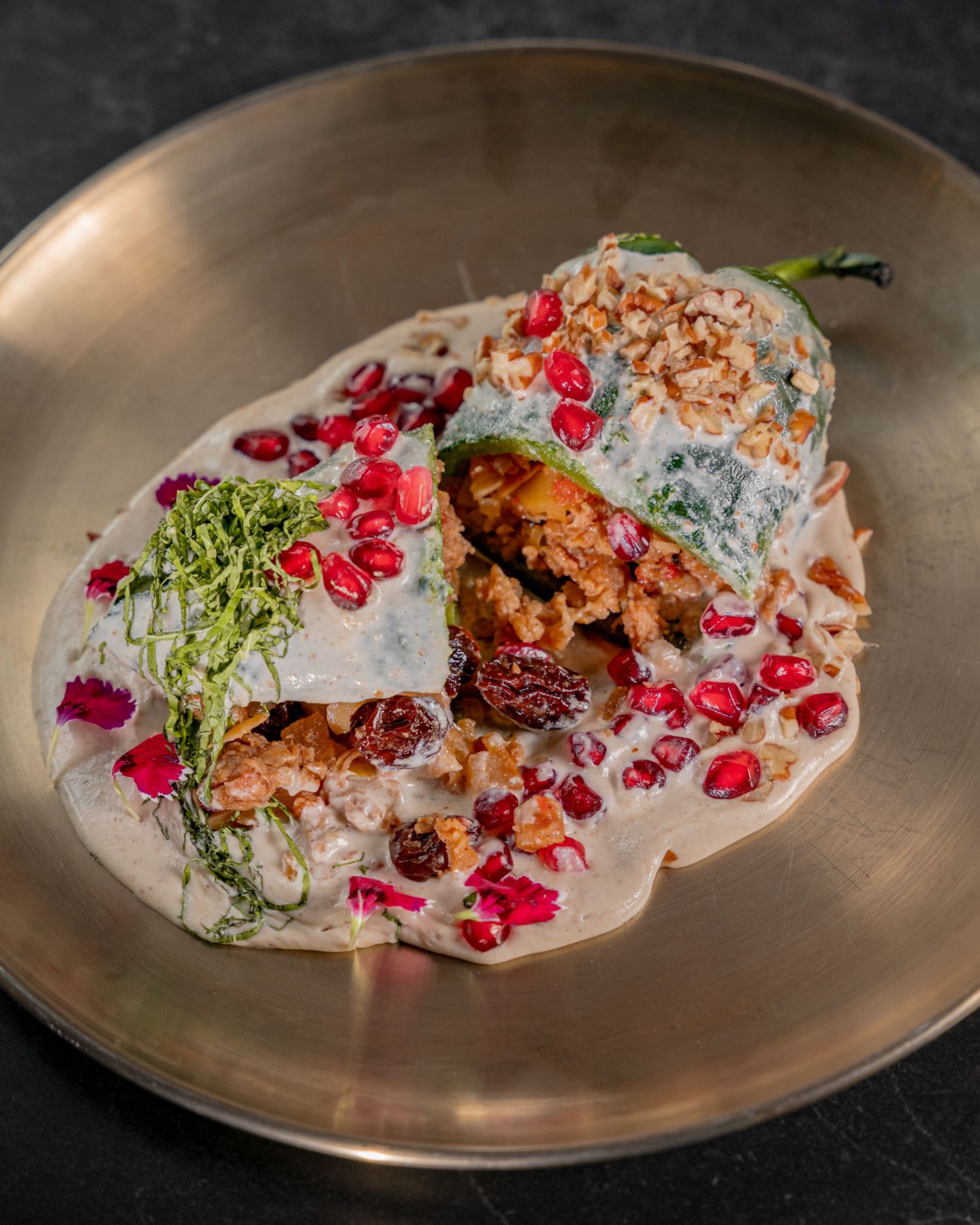 En su exterior gozarás de una salsa tipo nogada que en comparación a la tradicional en la cocina mexicana, el dulzor lo aporta el jarabe de ciruela que se utiliza comunmente en la cultura coreana, le brinda el balance perfecto, ya que si es goloso pero no satura el paladar. También es importante mencionar que como decoración este chile en nogada con un toque coreano, consta de la típica granada, pero en lugar de utilizar perejil se utiliza una hoja laminada de ajonjolí, misma que tiene un gusto muy singular al ser fresca en boca. Será una verdadera sorpresa, en sentido positivo; aquí recomiendan maridarlo con un vino rosado para intensificar los sabores.