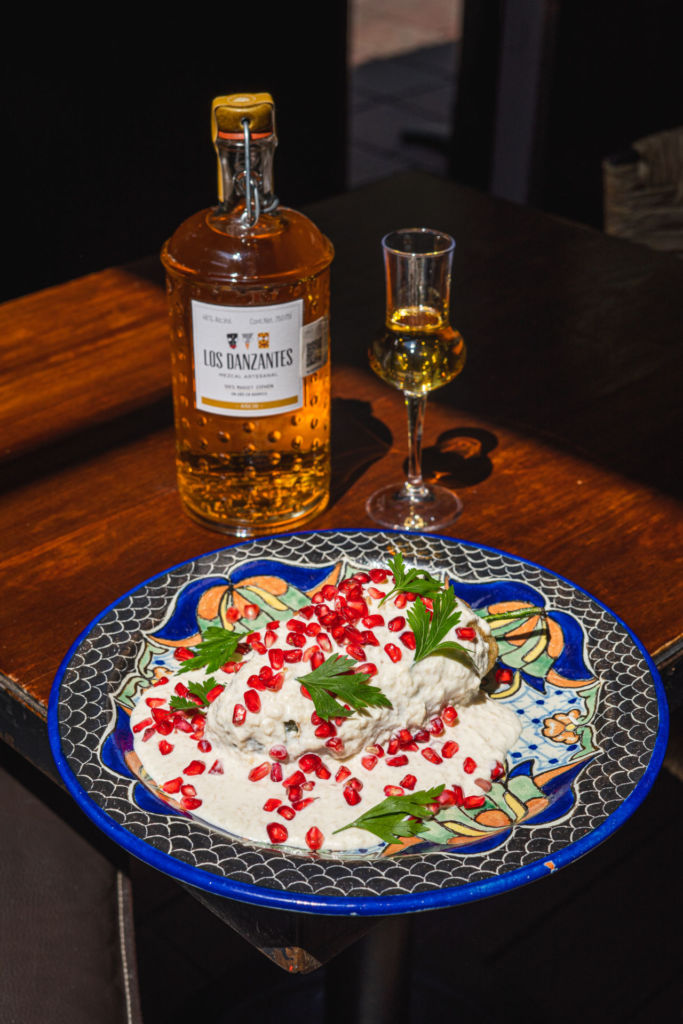 Este restaurante en el corazón de Coyoacán celebra nuestra tierra y cultura a través de una selección del mezcal artesanal y la cocina tradicional mexicana, así que claro, tienen una temporada de chiles en nogada. El chef Alejandro Piñón prepara la clásica receta poblana con los mejores ingredientes de temporada y carne de res y cerdo, dando como resultado un verdadero manjar de 400 gramos aprox. Lo sirven capeado y con una nogada quebrada de textura diferente y deliciosa. La sugerencia es maridarlo con Mezcal Añejo Los Danzantes.