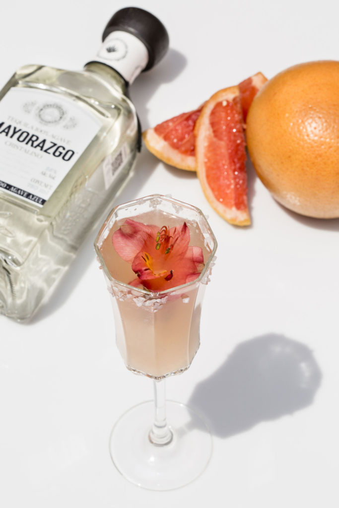 Escarcha el borde de una copa previamente enfriada con limón y sal de grano. Vierte una onza y media de tequila Mayorazgo Cristalino, dos onzas de jugo de toronja y media onza de jugo de limón en un shaker con hielos y agita hasta enfriar. Sirve la mezcla en la copa y añade un top de prosecco. Decora con una flor como garnitura.