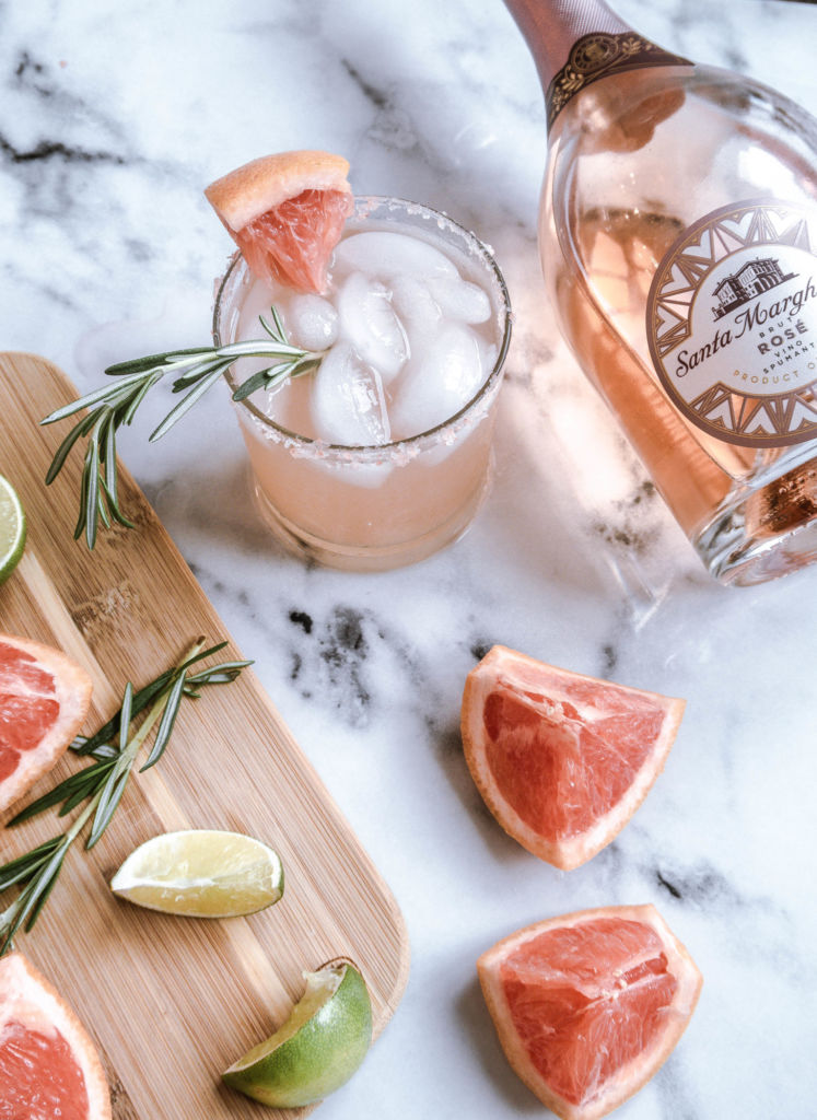 Esta receta rinde para dos margaritas. Primero, escarcha dos vasos con un poco de limón y sal de himalaya. Agrega hielo. En un shaker agita el jugo de toronja, jugo de limón, miel y tequila, es recomendable que tus ingredientes estén a temperatura ambiente para que la miel se disuelva completamente. Posteriormente, agrega el vino espumoso rosado. No agites tu shaker para que tu vino se mantenga espumoso. Sirve en tus vasos y decora con romero fresco.