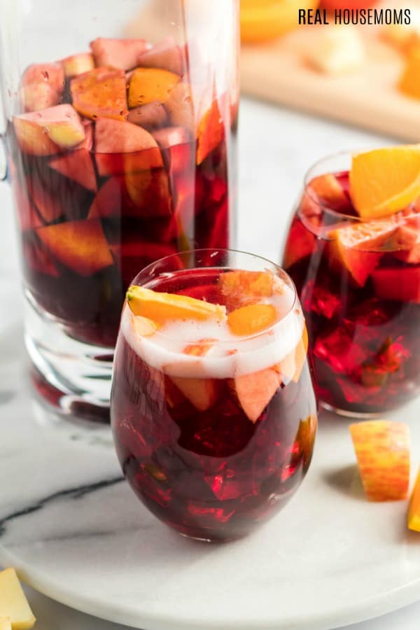 A una jarra grande agrega el vino tinto, manzana, naranja, licor de naranja y jugo de manzana. Refrigera por al menos una hora, aunque es recomendable hacerlo por seis para que la bebida sea más concentrada. Para preparar cada bebida, llena una copa con hielos y agrega la mezcla de sangría, dejando espacio para posteriormente incorporar 60 mililitros del vino espumoso.