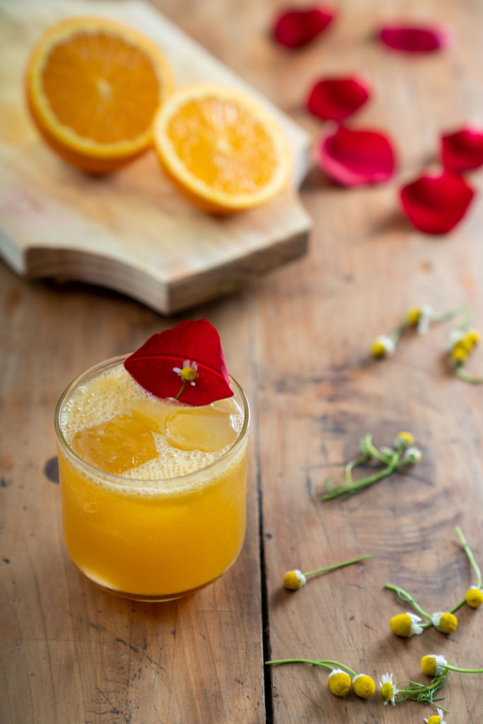1) En un shaker agrega jugo de naranja, la infusión de manzanilla y el whisky ( te recomendamos Woodford Reserve).