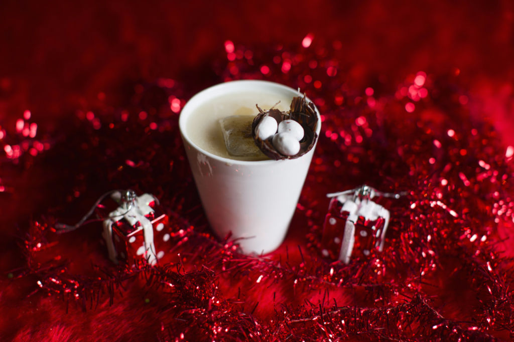 Para los amantes de los sabores fuertes, este drink está preparado con: eggnog, sake, Buffalo Trace bourbon, Giffard de cacao, jarabe y ralladura de nuez moscada como garnitura.