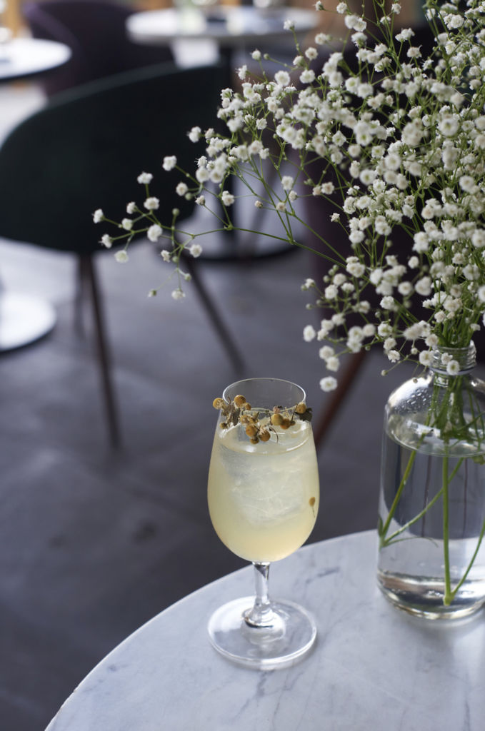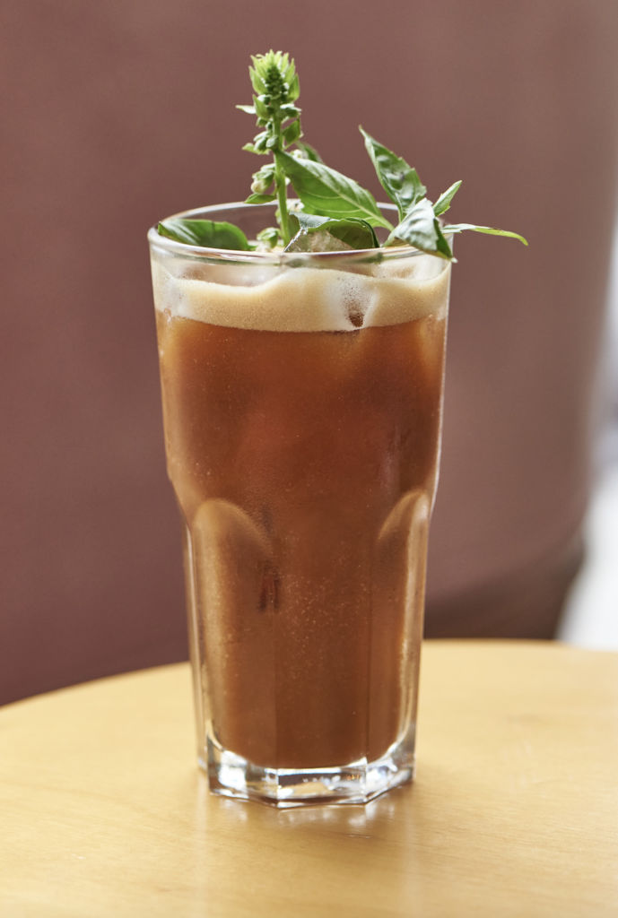 - Shakear y posteriormente servir en un vaso cupé, se decora con garnish de hoja de albahaca.