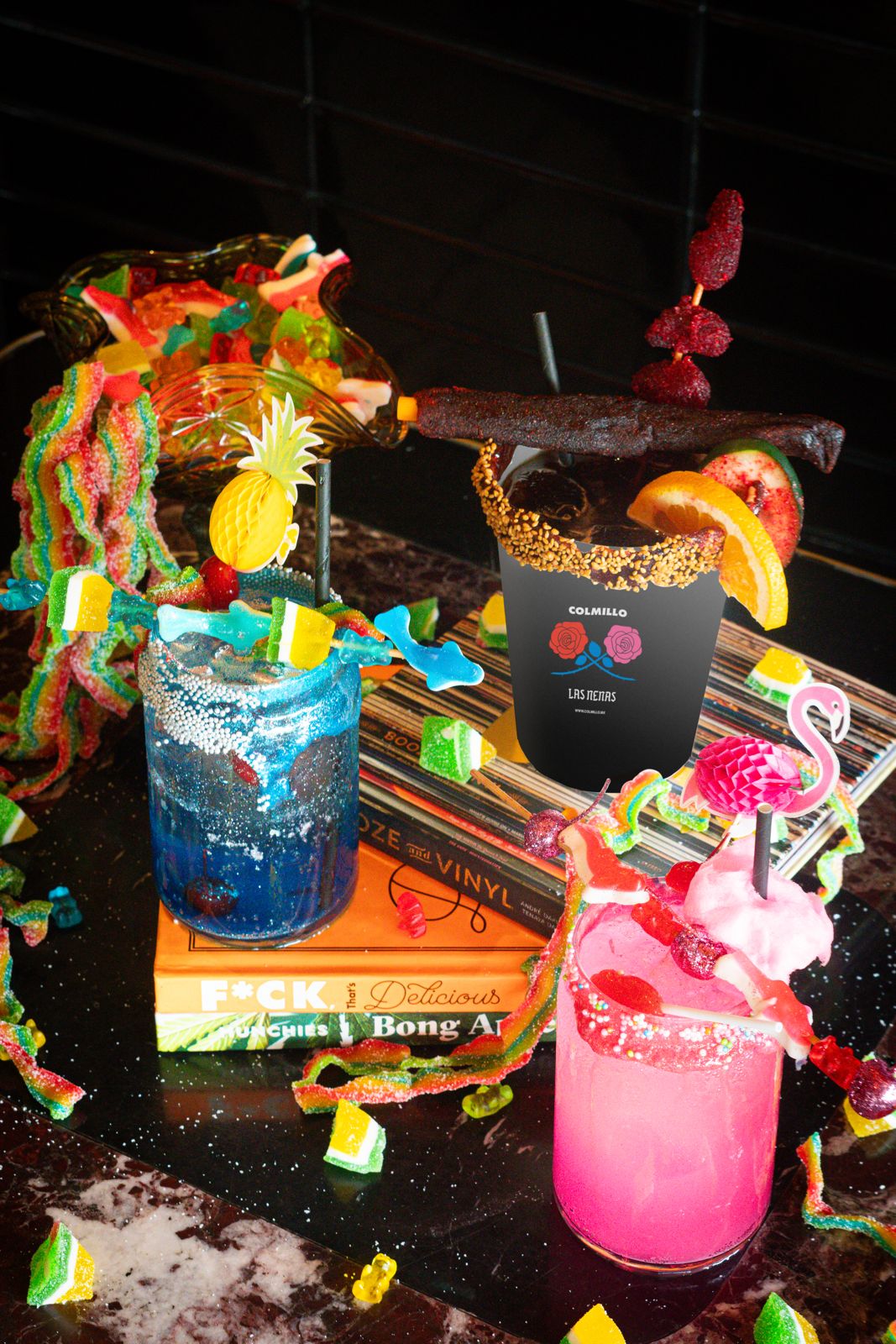 Si eres amante de las micheladas, las ‘gomichelas’, los azulitos y todos los ‘drinks’ que desafían los límites entre la bebida y la botana o el postre, entonces te encantará descubrir su menú. Puedes acudir directamente a su puesto en el mercado de La Lagunilla todos los domingos, o bien, aprovechar la colaboración entre Colmillo y Las Nenas de aquí al 8 de septiembre para probar tres de sus recetas más emblemáticas: la Michelada —cerveza, salsa negra, limón, pepino, Miguelito, ajonjolí y gomitas enchiladas—, el Azulito —vodka, Boost, refresco, pulpa de mora azul, gomitas de piña y cerezas en almíbar— y el Pinky —ron, refresco, paleta de caramelo, gomitas y algodón de azúcar—.