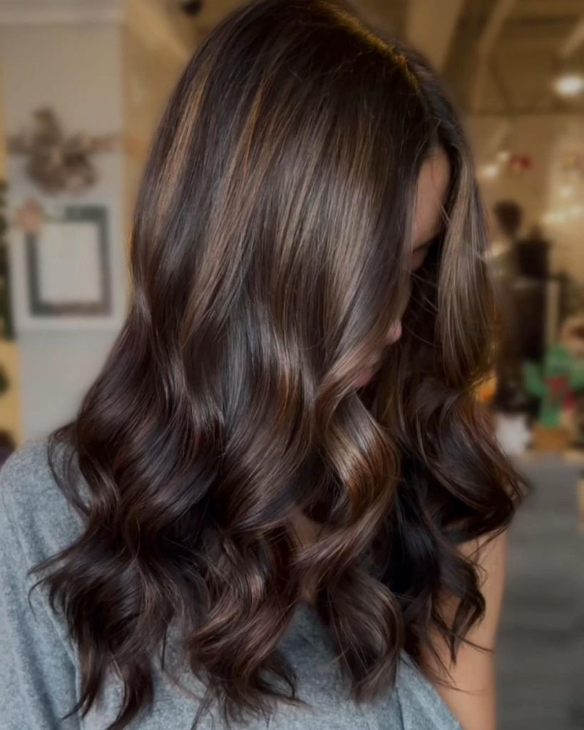 Pide a tu estilista que agregue algunos tonos diferentes de café en todo el pelo (como este look, que lleva algunos reflejos cerca de la raíz) para enfatizar la longitud de tu pelo y agrega algo de movimiento a tu melena. No tienes que agregar reflejos o un balayage si no quieres, tiñe todo tu pelo con un chocolate intenso que te hará resaltar sí o sí en tu próxima fiesta navideña.