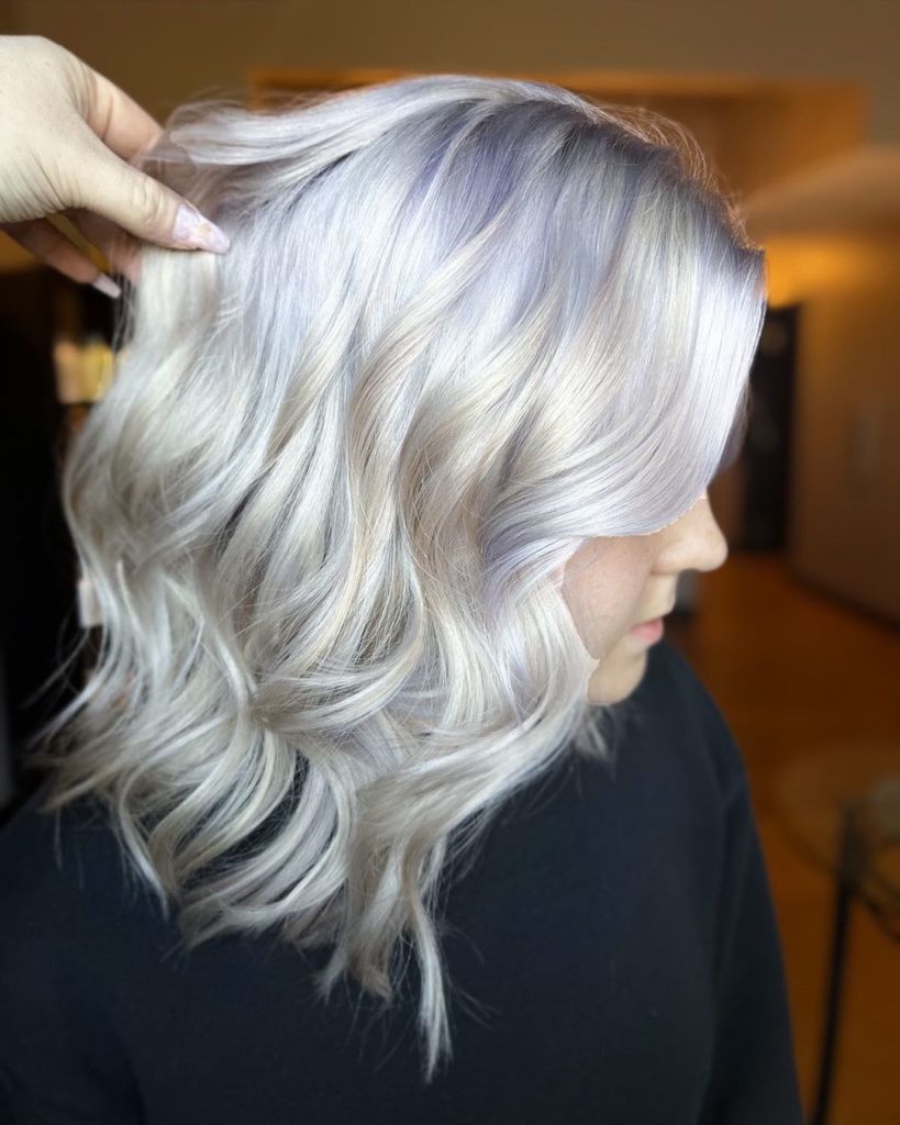 Nos encanta este tono de rubio que tiene un efecto de color un poco blanco, un poco pastel y extra brillante. Agrega un poco de color lila a las raíces o esconde algunos destellos dentro de tu pelo para vislumbrar el color cada vez que se mueva. O puedes aplicar un poco de rosa para darle una apariencia pastel más atenuada. Le dará un color apenas visible mientras agrega algo de calidez.