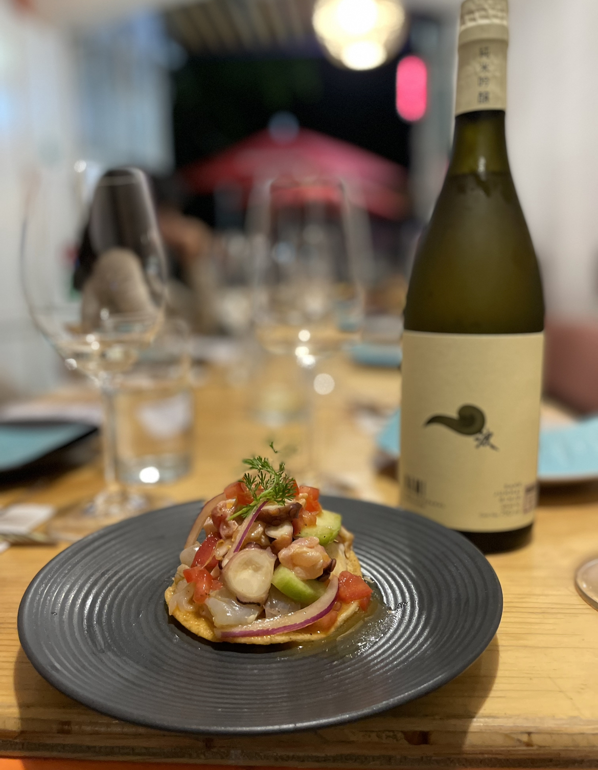 Para Nami Junmai Ginjo –que es un semiseco con notas a ciruela y durazno– se hizo un maridaje con una tostada de pulpo, camarón azul salvaje, camarón seco y pescado. Mientras que para Nami Junmai Daiginjo –que es la estrella de la casa, un sake de alta complejidad– se hizo un taco de ostión rebozado estilo Baja–, y para finalizar un pay de cacahuate con sake Junmai.