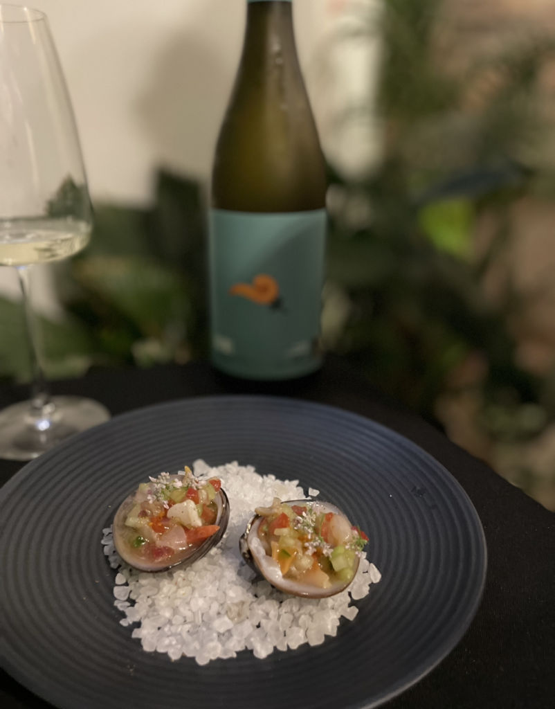 El menú de tres tiempos está planeado para servirse con las tres variedades de sake, y este se creó en base a un festejo japonés llamado Umi No Hi –que se celebra a inicios de julio para agradecer las bondades del mar–. Para el maridaje con Nami Junmai –que es ligero y fresco en boca, con notas frutales– se sirven unas almejas con tomate y una salsa especial de la casa.