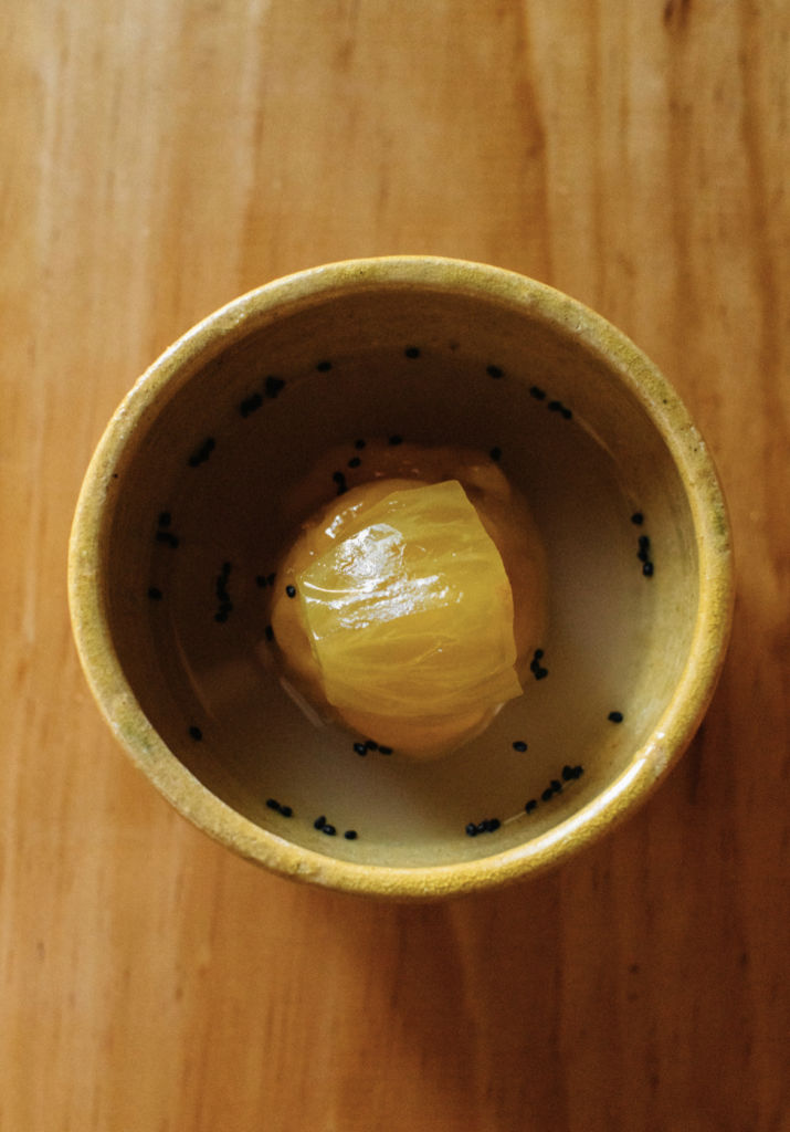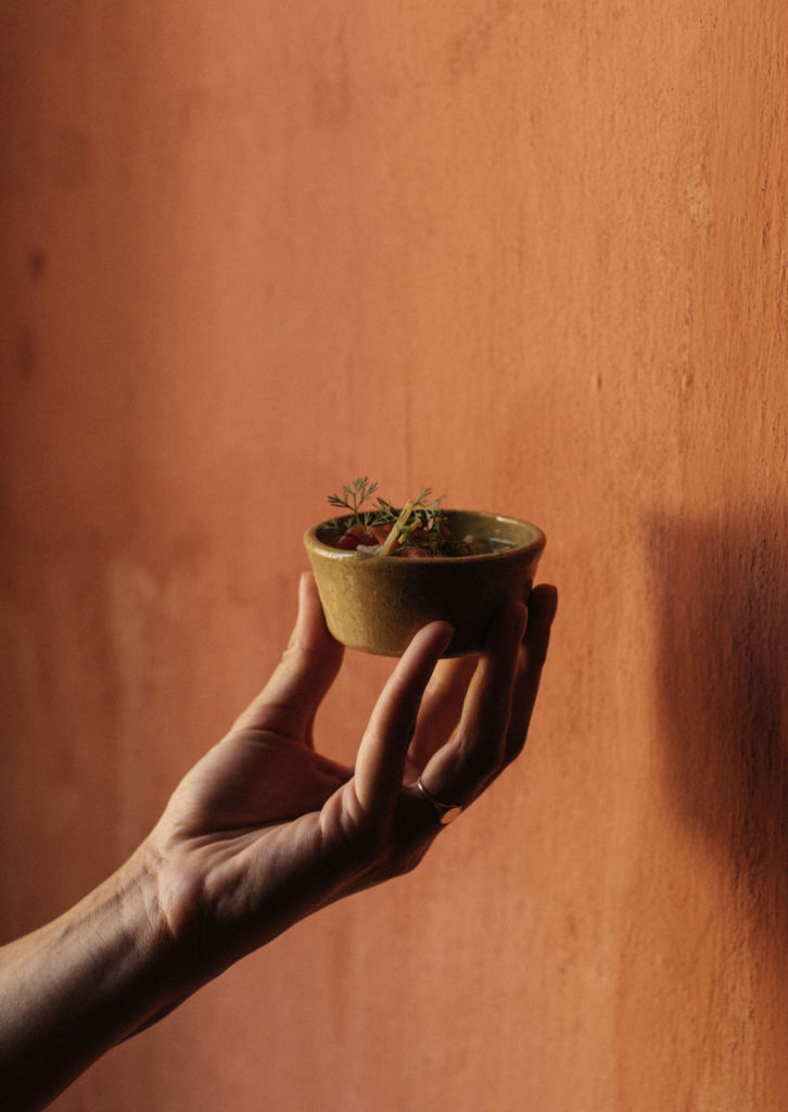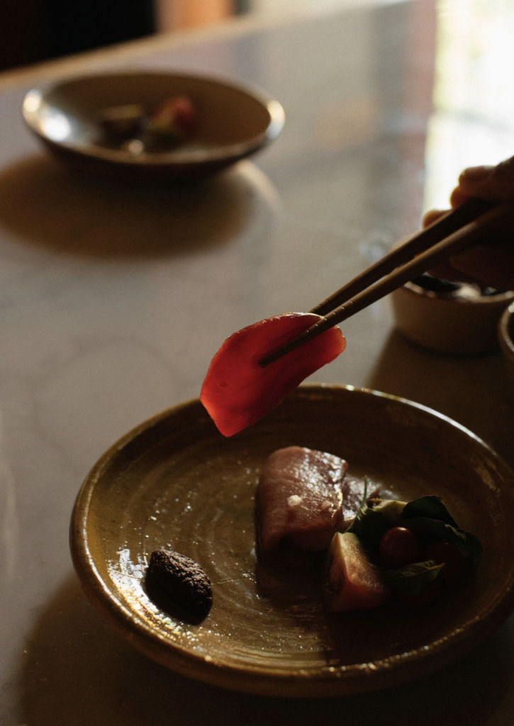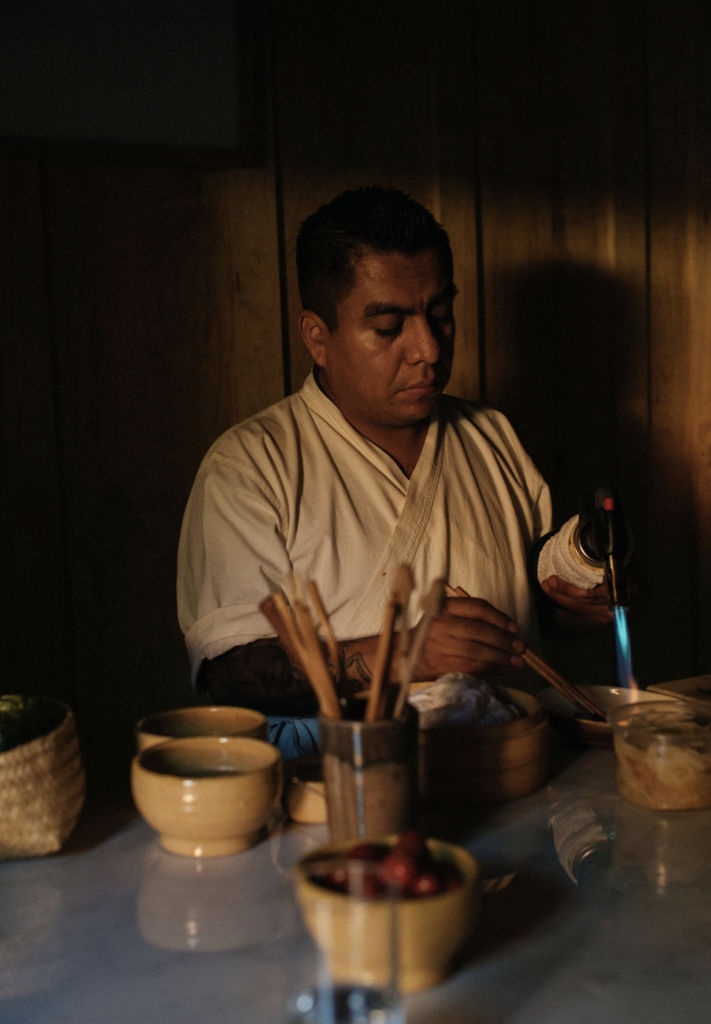 Una barra, doce lugares y la maestría de un cocinero que apasiona en cada movimiento, eso es lo que encontrarás al entrar a Crudo Oaxaca. Aquí cada detalle hace la diferencia entre una barra tradicional japonesa, y la barra de omakase de Ricardo, en la cual la esencia de Oaxaca se denota en los elementos que adornan el lugar; platos de barro, mezcaleros, silla de palma y tonos marrones que le aportan elegancia y una remembranza al barro oaxaqueño.
