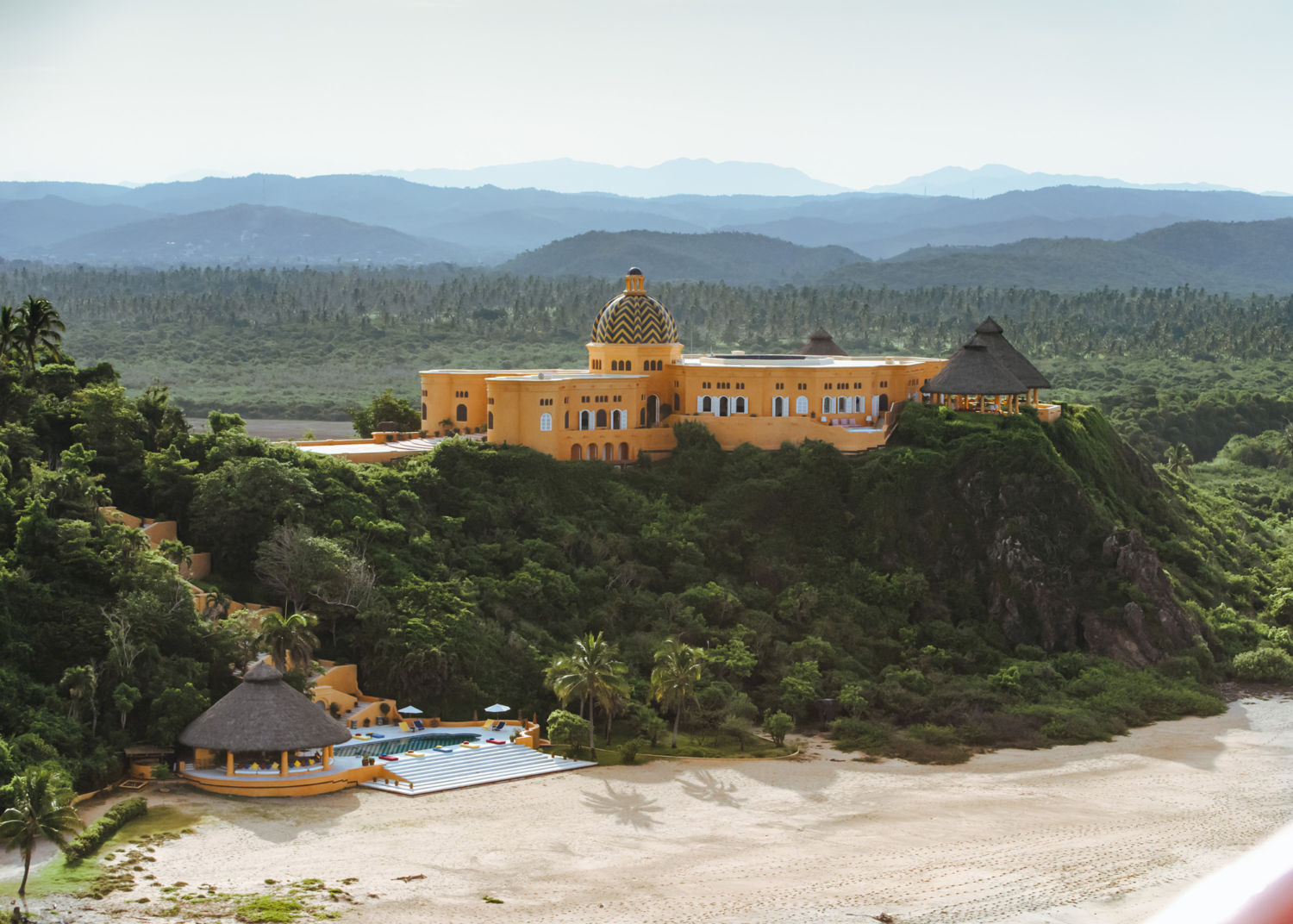 El diseñador, Roberto Couturier fue el encargado de dar vida a esta residencia, misma que destaca por su peculiar arquitectura que parece ser un templo situado en medio de la naturaleza y, por supuesto, por su icónica fachada en color amarillo-naranja que resulta ser su atractivo principal, al igual que su cúpula de azulejos azules. Gracias a estos atributos y al estar situado en un paraíso terrenal celebridades como Kendall Jenner, Madonna, Bill Gates y hasta el mismísimo Mick Jagger se han hospedado en esta residencia.