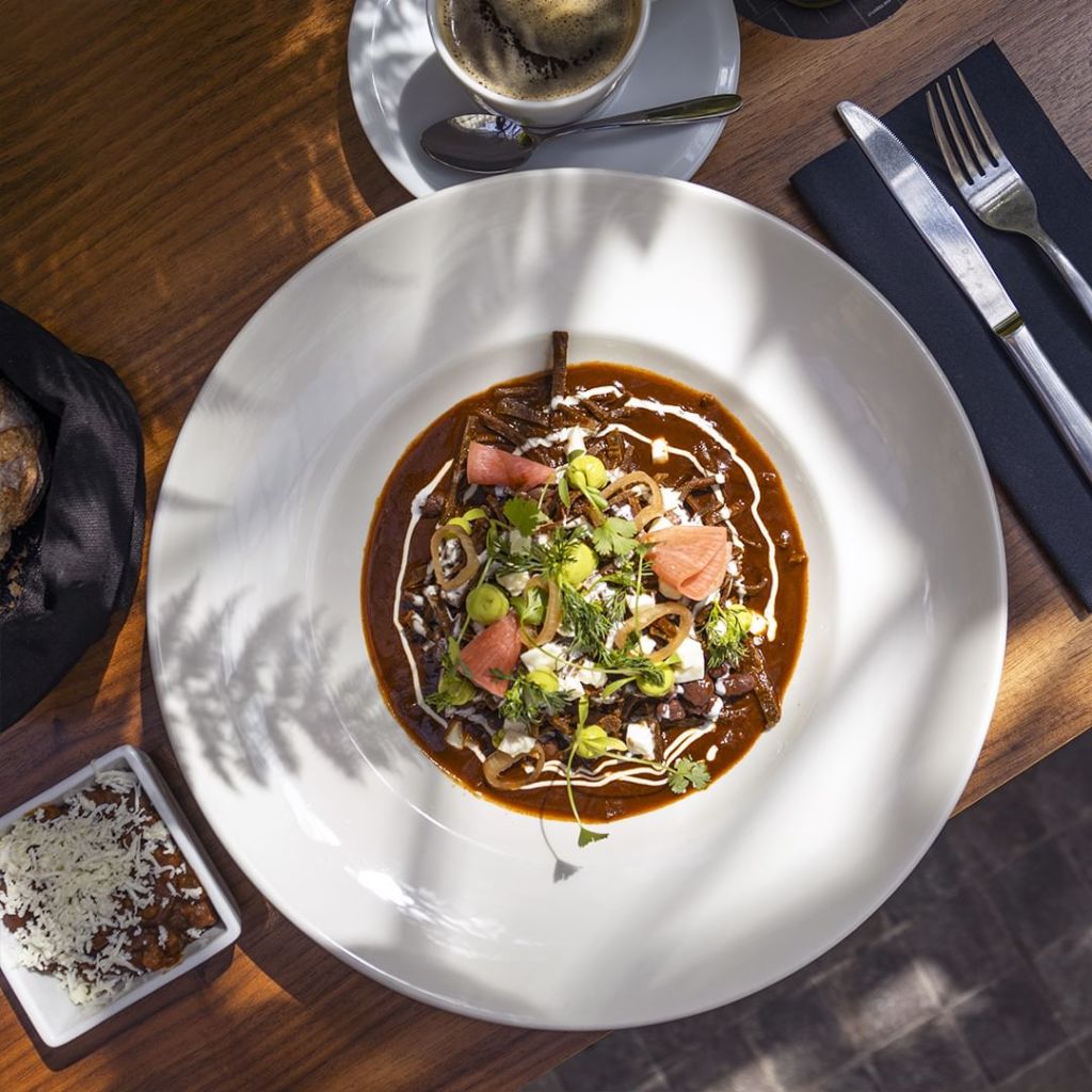 La cocina de Tierra Adentro pone sobre la mesa los sabores y recetas más emblemáticos del país. Desde las enjitomatadas y las enchiladas Ejutla de Jalisco hasta chilaquiles de chilmole inspirados en el recado negro yucateco. El pan dulce es otro manjar que le da la vuelta a las piezas más tradicionales para darles un toque todavía más mexicano según la temporada, como las conchitas de mamey, mermelada de café, ponche de frutas y tejocote con vainilla.