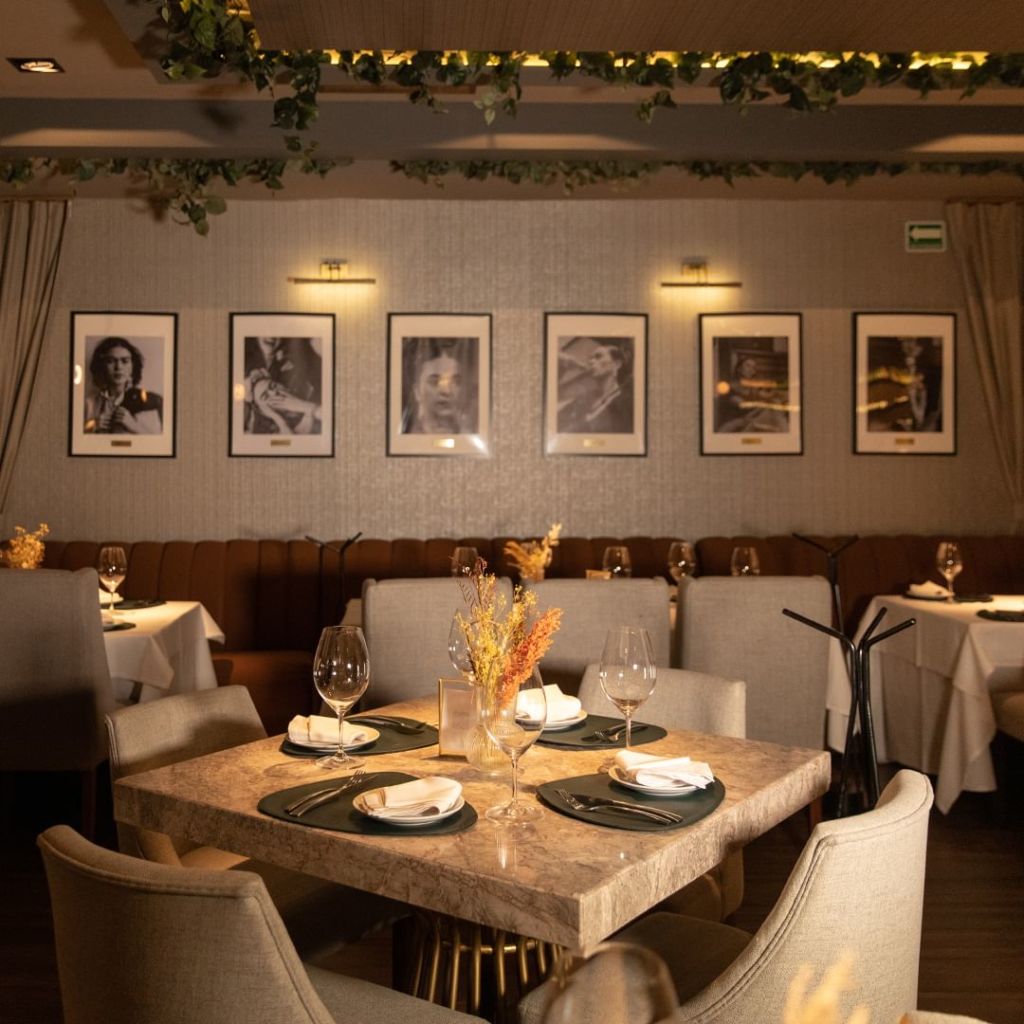 Complementando perfectamente su menú, el diseño en Diego y yo retoma obras y retratos de algunos de los pintores más emblemáticos de México, por lo que sus paredes asemejan un recorrido museográfico por la historia artística del país. Emana una esencia clásica y sofisticada, con vegetación natural sutil colgando desde su techo, al igual que luces cálidas, mesas de mármol, pequeños detalles metálicos, y una enorme cava donde apreciar su selección especial de vinos.