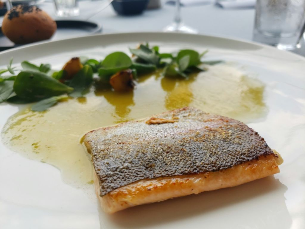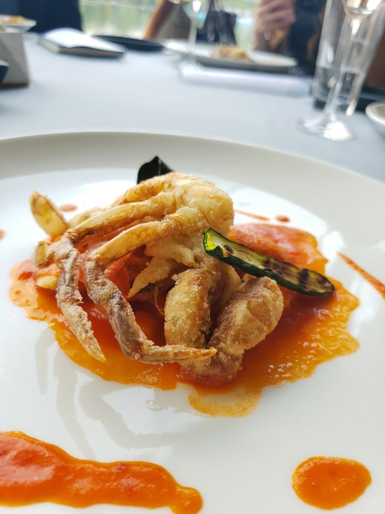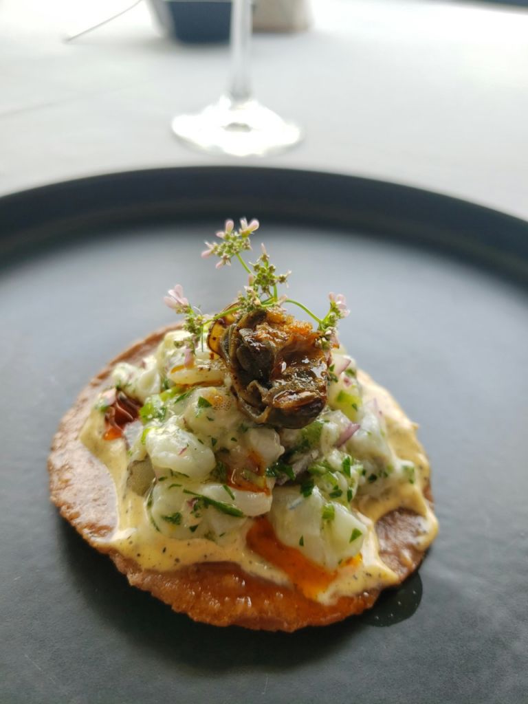 Para continuar, el amable servicio del lugar te servirá una Tostada de Ensenada con tartar de camarón azul del Pacífico y ostión ahumado, seguido de un Tamal Colado con pulpa de jaiba, calabaza de castilla y jaiba suave frita.