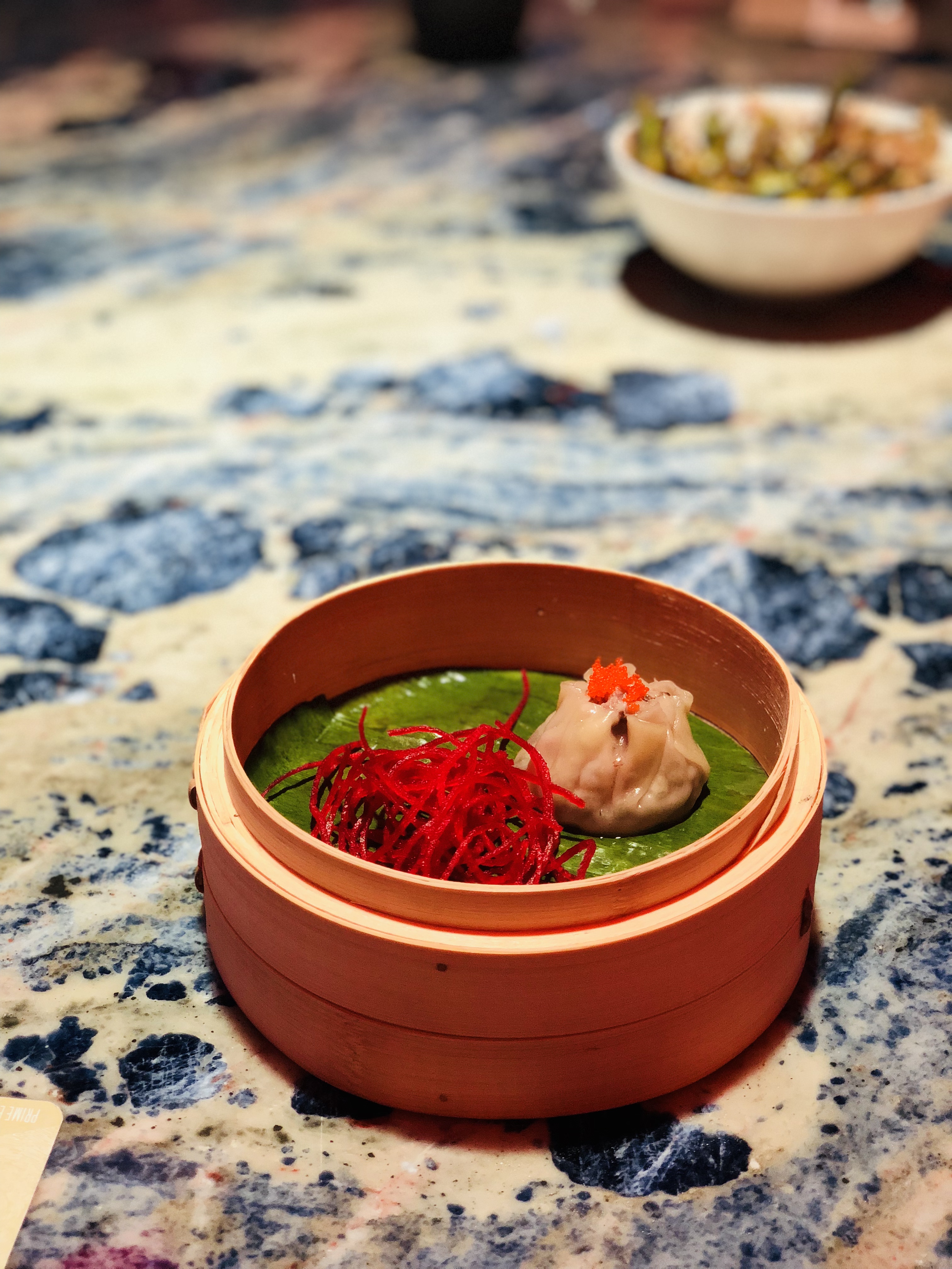 Al poco tiempo llegaron los tacos de lechuga rellenos de cachete de res con kimchi y hongo shiitake, servidos dentro de una vaporera de bambú y cocinados de forma que la carne se deshace en la boca mientras el kimchi le otorga ese toque asiático que tanto nos encanta. En el segundo nivel de la vaporera, nos encontramos con un dumpling de carne molida de cerdo y masago. Una delicia que atrapa en su interior los jugos de la carne, conservando todos sus sabores.