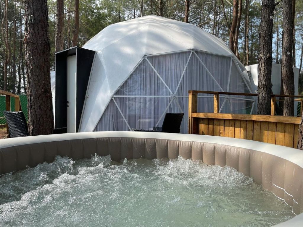 Lo que hace tan especial Ensueño Glamping es que algunos de sus domos ofrecen maravillosos jacuzzis de vista al bosque, completamente al aire libre y perfectos para una experiencia romántica en pareja. Por las noches podrás prender las lucecitas colgantes de la terraza, lo que creará una atmósfera aún más íntima y acogedora.