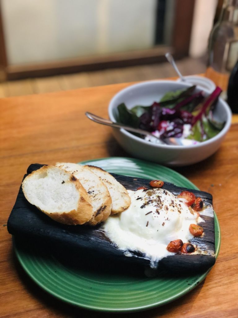 ¿Eres fanático del queso? Entonces esta entrada es para ti. La textura suave de la burrata se funde a la perfección con la acidez de los jitomates rostizados. Lo sirven con rebanadas de pan tostado para que sea más fácil compartirlo. Te va a encantar.