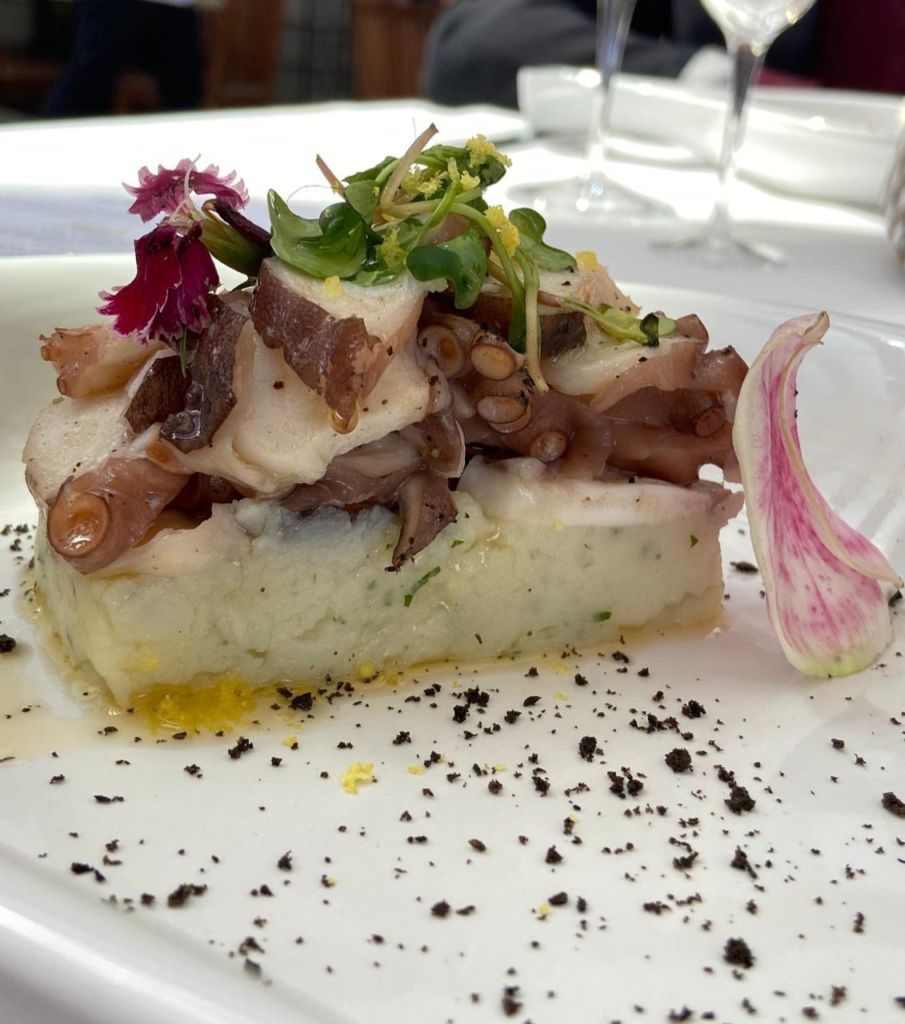 Dentro de este menú, te recomendamos probar su ensalada de pulpo con papa orgánica, perejil y polvo de aceituna negra. La cocción del pulpo es perfecta y el puré es sencillamente exquisito. La mantequilla lo vuelve cremoso y muy suave. Para cerrar con broche de oro, también degustamos su mousse de queso de cabra con culis de Jamaica y puré de guayaba. Es un postre digno para dar por terminada una gran comida.